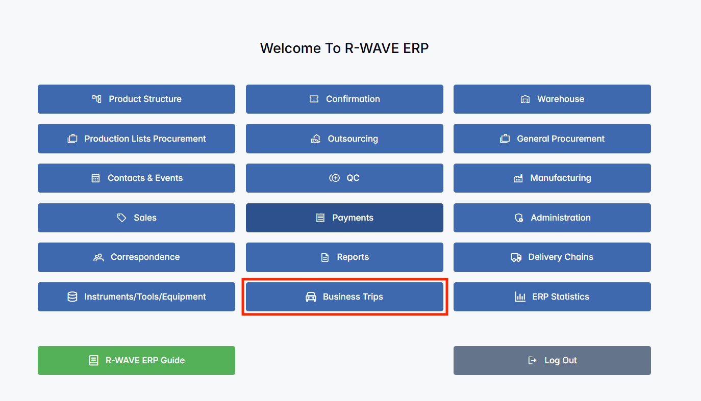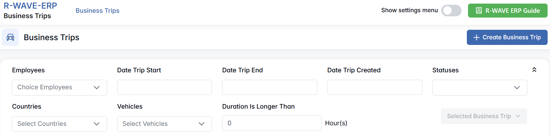 The Business Trips module in R-WAVE ERP is designed to help organizations plan, manage, and track employee travel. It provides a centralized space for documenting trips, assigning employees, and ensuring visibility of travel across departments.
