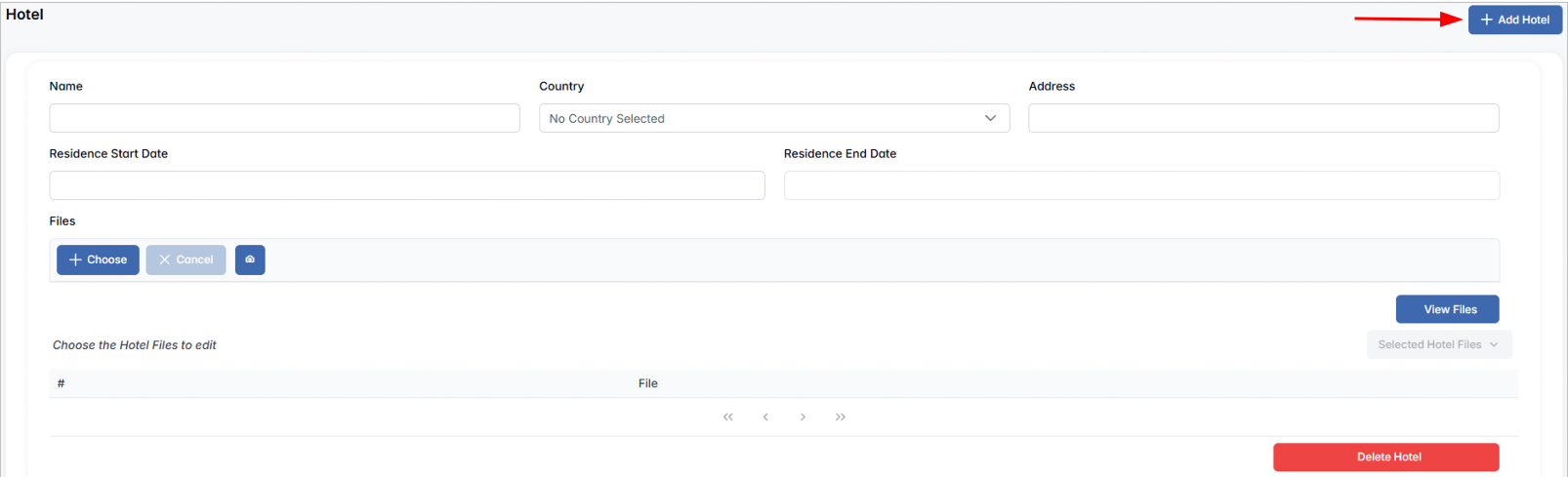 You can also upload hotel-related files, such as bookings or invoices, and manage them using the table interface: View file, Selectede Hotel files and Delete Hotel.