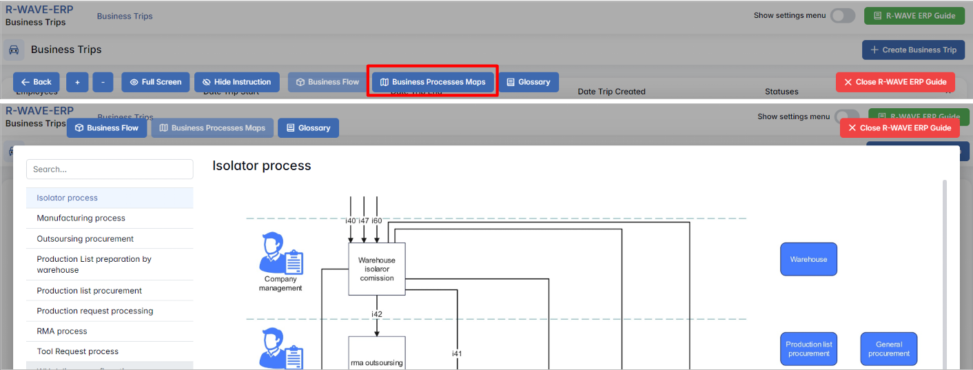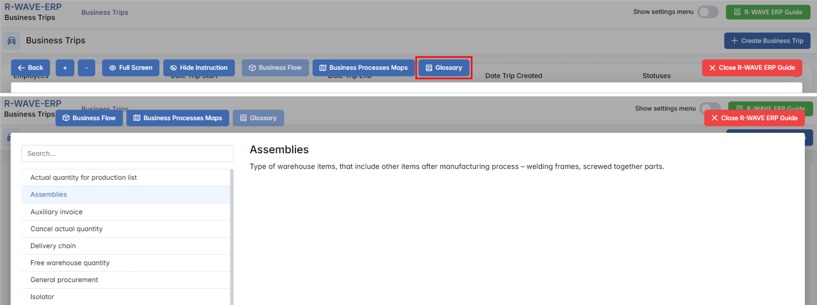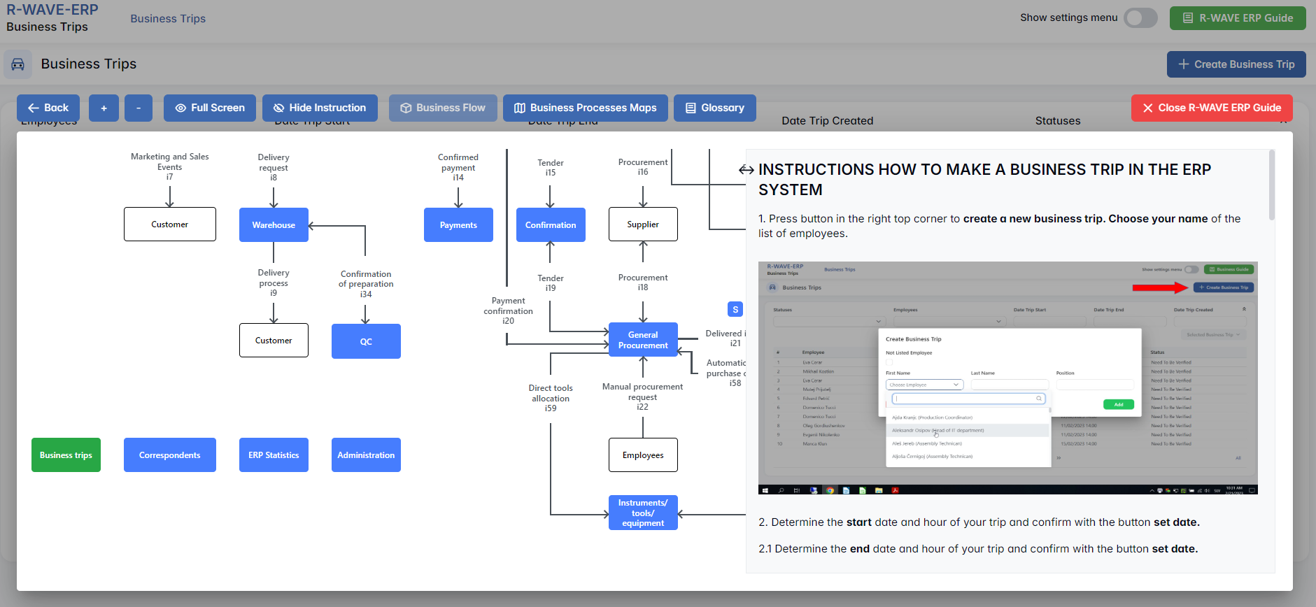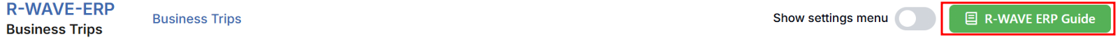 To support user navigation and clarity, R-Wave ERP includes a built-in contextual help system in the form of a pop-up guide window. This feature is available across different modules, including Business Trips, and is designed to help users understand where they are in the system and how to use the current section effectively.