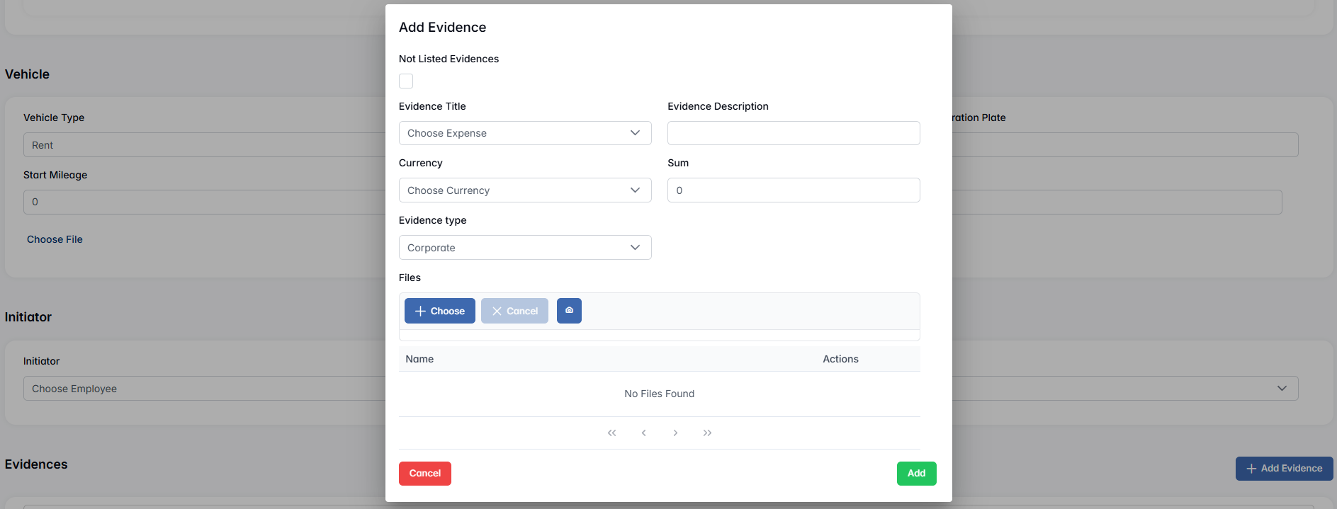 If no files are uploaded, the message "No Files Found" will appear. Once uploaded, files will be listed with the option to delete if needed. - Click Add in the popup to finalize the evidence.
