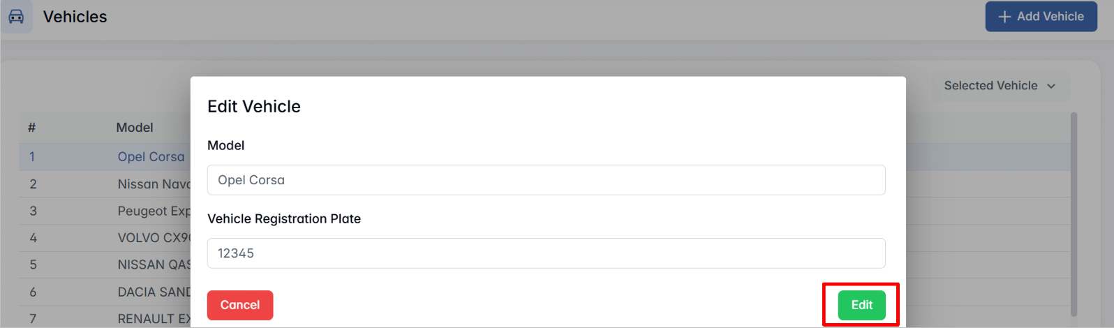 This list helps administrators maintain an organized set of available vehicles for company use, rentals, or mileage tracking.