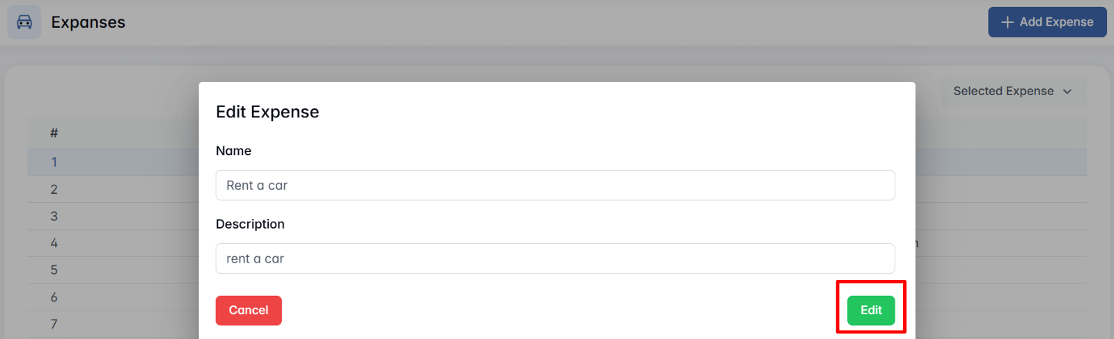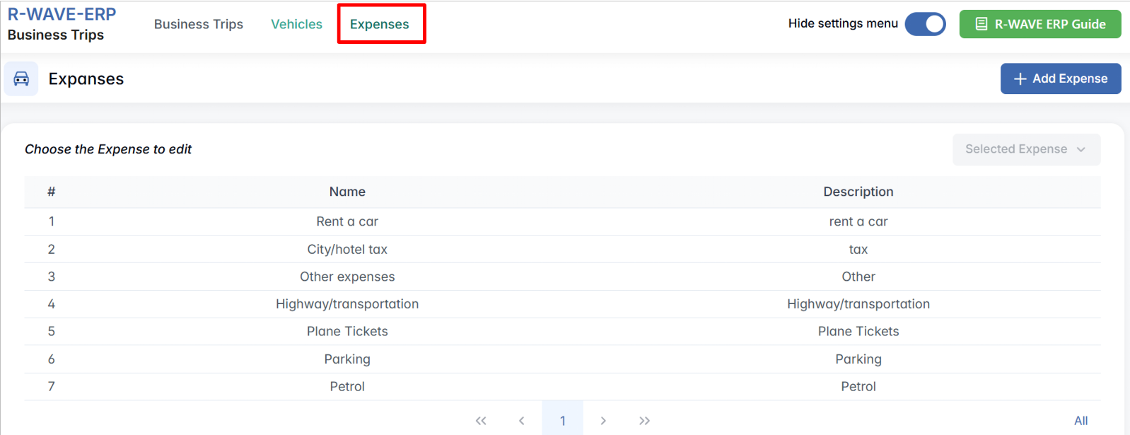 After entering the Expenses section, you will see a list of all existing expense types. Each row includes: