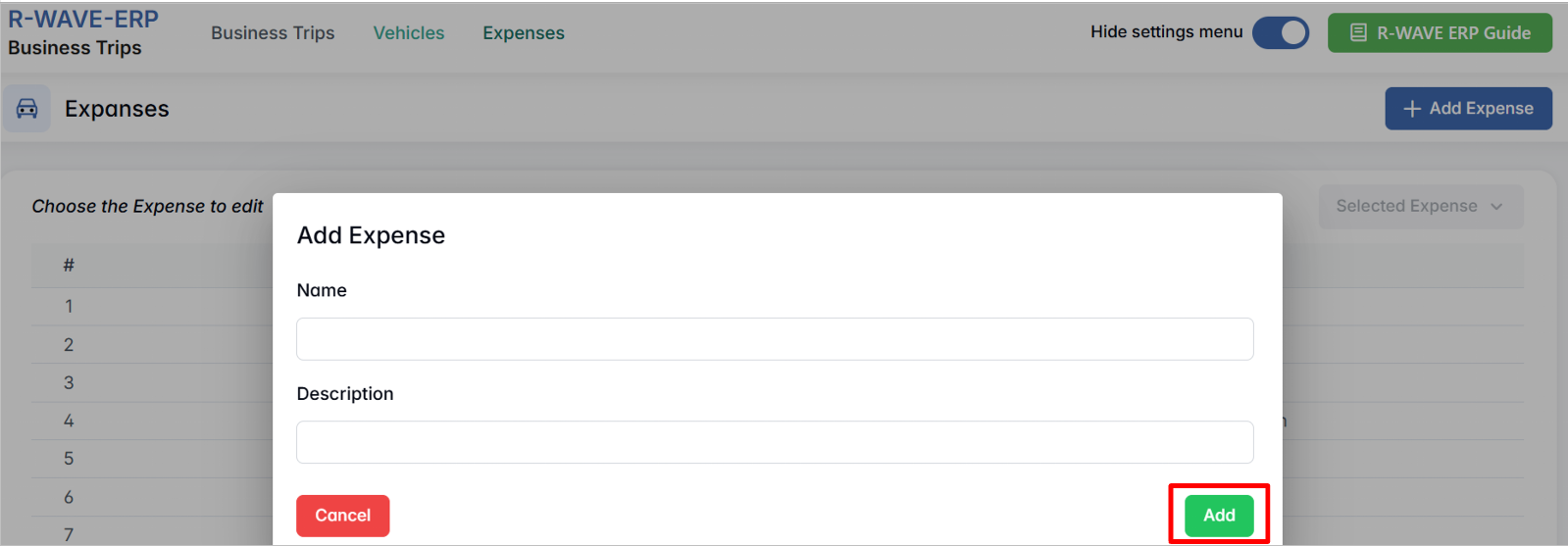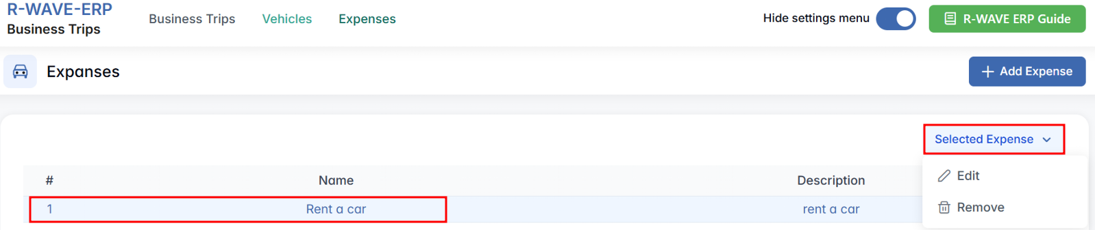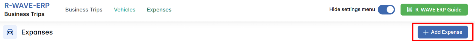 The Expenses section within the hidden settings menu allows you to manage predefined types of expenses that can be later selected when adding evidence to business trips. This helps standardize reporting and streamline data entry.
