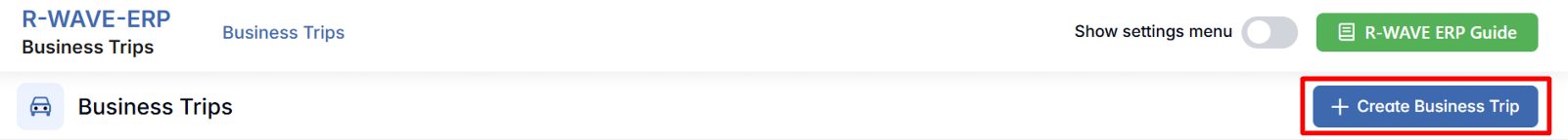 From the main menu of the ERP system, click on Business Trips to enter the module. At the top-right corner of the screen, you’ll see the button + Create Business Trip — click this to start the creation process.
