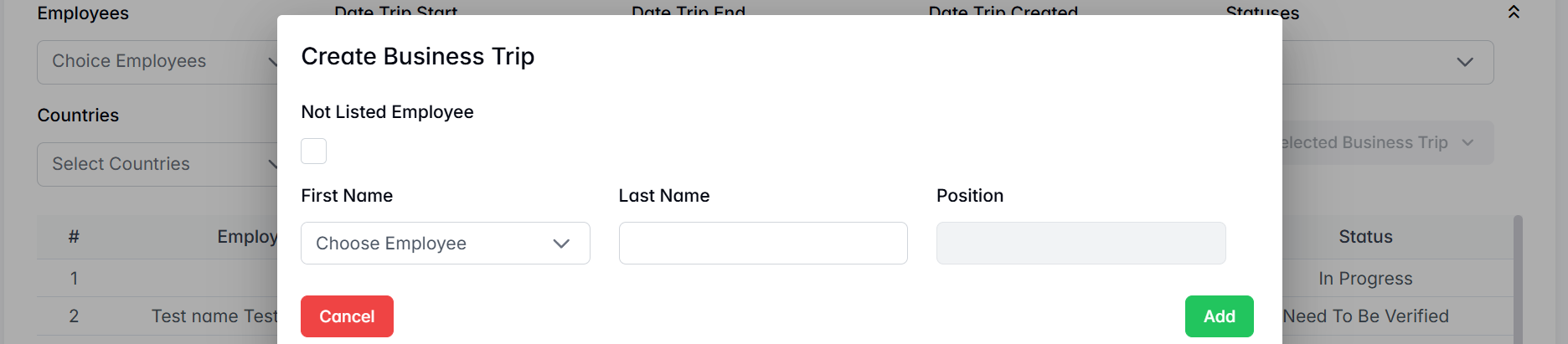 After entering the information, click Add to save the business trip. The trip will now appear in the main list and can be edited, filtered, or reviewed at any time.