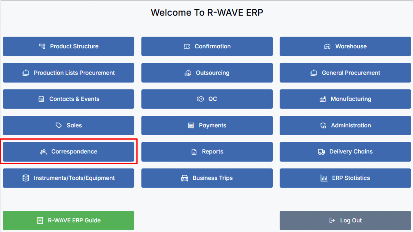 The Correspondence module in R-Wave ERP is built to streamline the handling of official communications within an organization. It helps register, store, and manage both incoming and outgoing letters from and to tax authorities, banks, partner organizations, and other external entities. By using this module, companies can maintain a well-documented history of correspondence and ensure that no important communication is lost or overlooked.