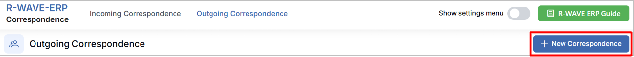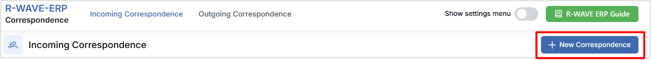 Navigate to the Correspondence module from the main menu. By default, the Incoming Correspondence view is opened. If you are not on this page, click the Incoming Correspondence button at the top of the screen. - Click +New Correspondence