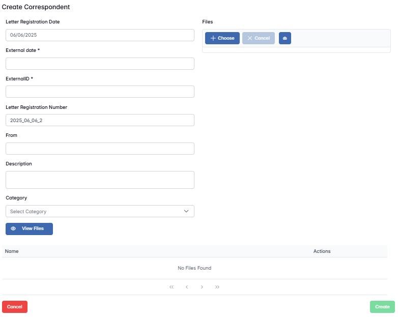 Once all fields are completed and files are attached (if needed), click the Create button. The correspondence will be saved and added to the list of outgoing records, fully traceable and filterable within the system.