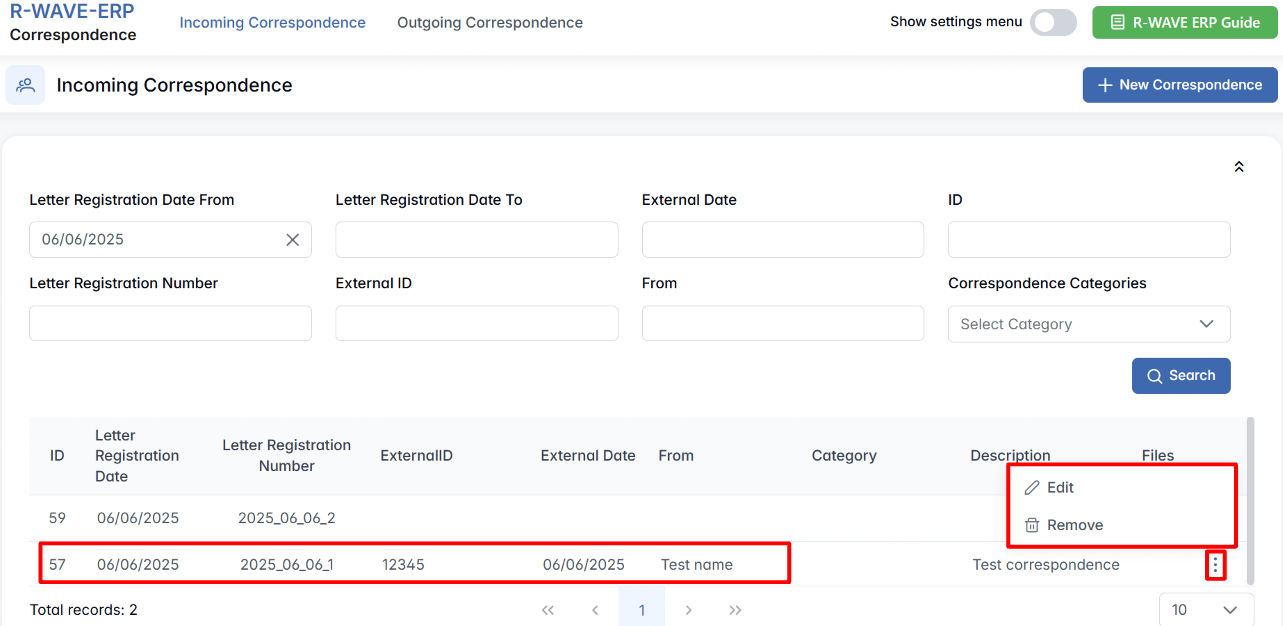 After a correspondence entry has been created, you may need to update its information or remove it from the system. This can be done directly from the Incoming Correspondence list.