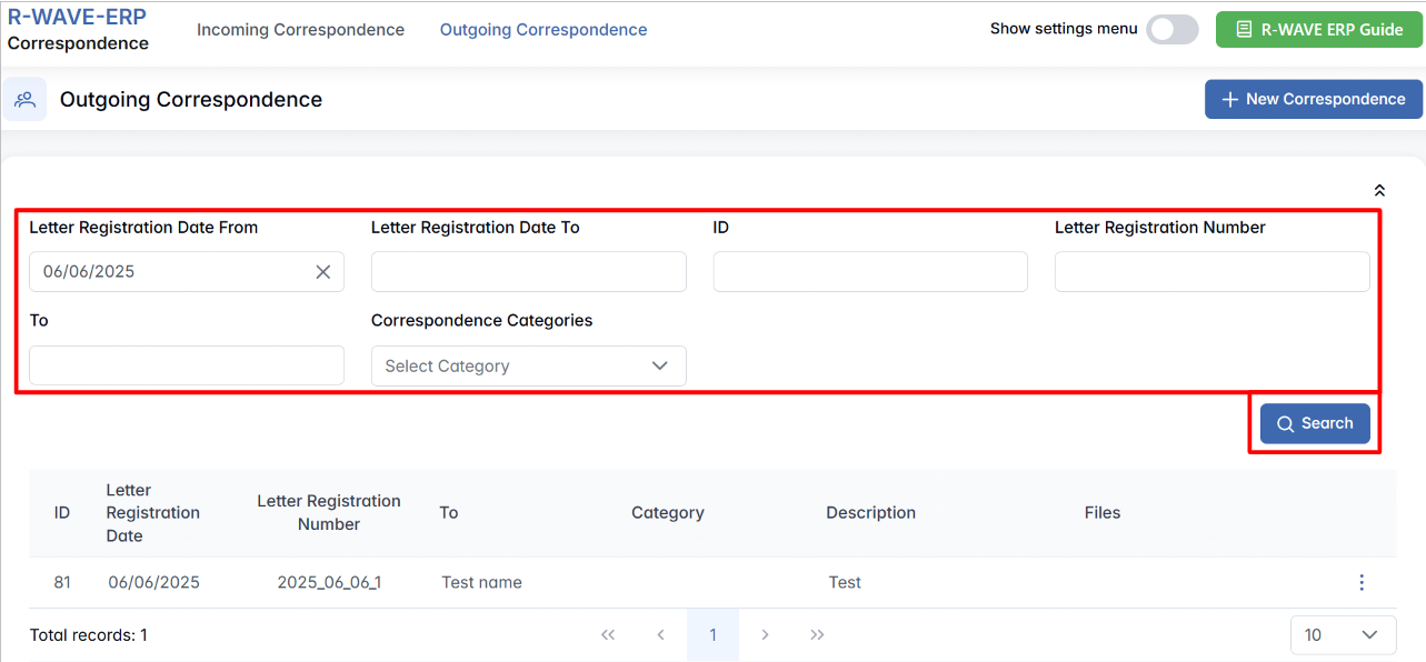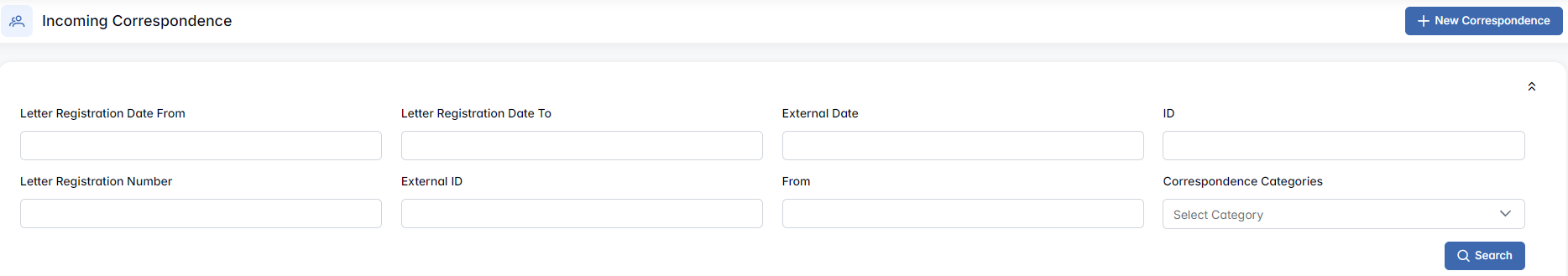- Search – Applies the selected filters and refreshes the correspondence list.