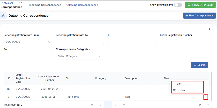 This quick-access menu makes it easy to manage correspondence records directly from the list, ensuring fast updates and streamlined record maintenance.
