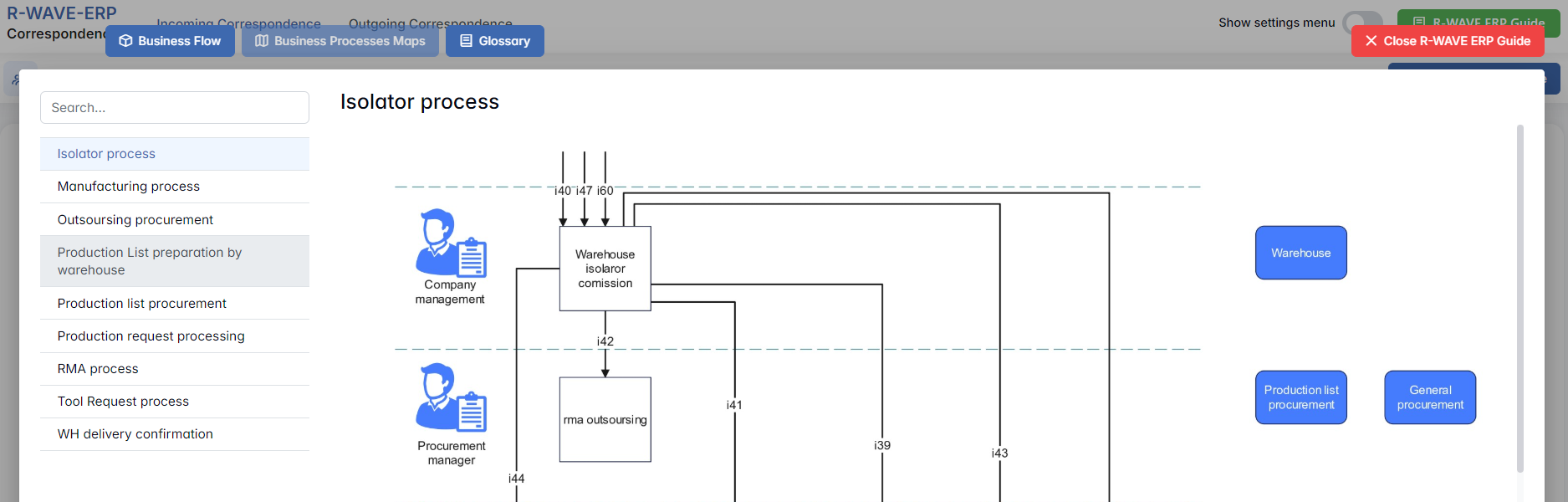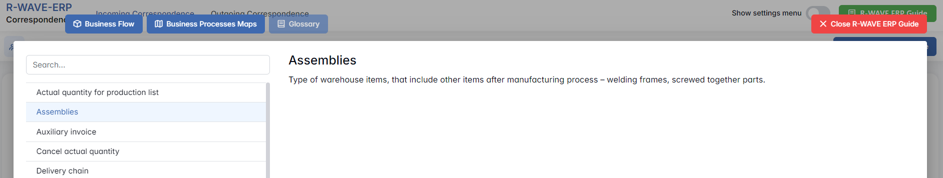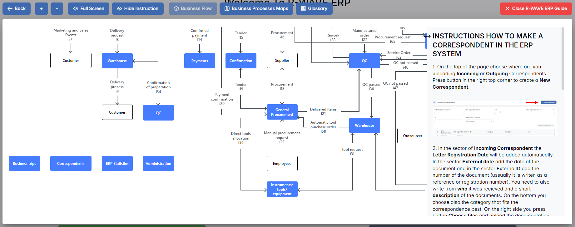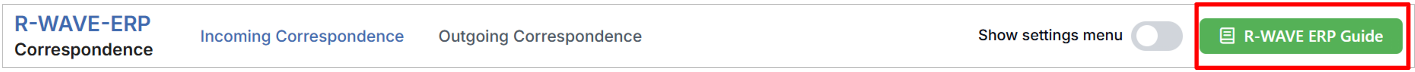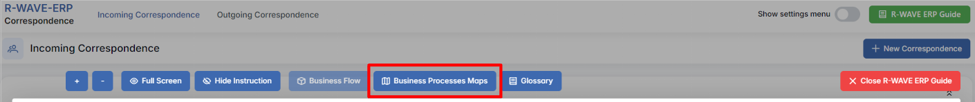 To support user navigation and clarity, R-Wave ERP includes a built-in contextual help system in the form of a pop-up guide window. This feature is available across different modules, including Correspondence, and is designed to help users understand where they are in the system and how to use the current section effectively.