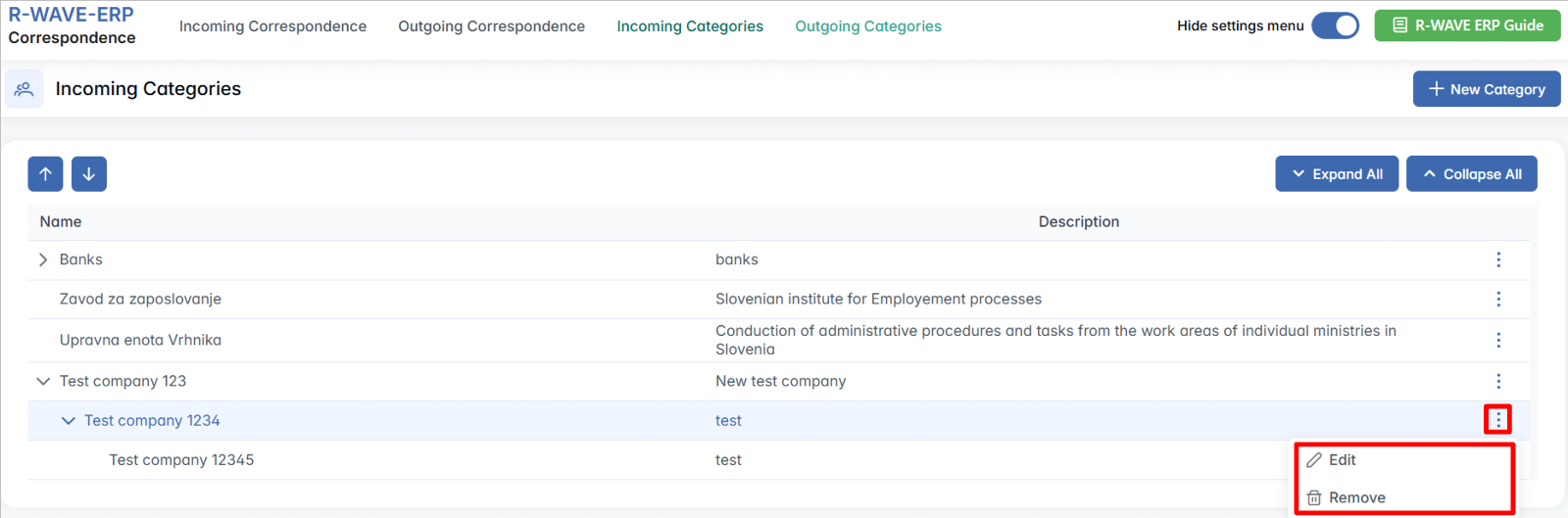 - Remove – Permanently deletes the category from the system.
