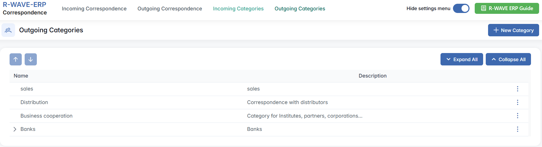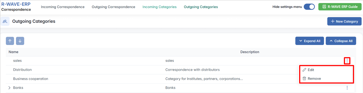 Deleting a category will remove it from the drop-down options used when registering correspondence. Be careful not to delete categories currently in use.