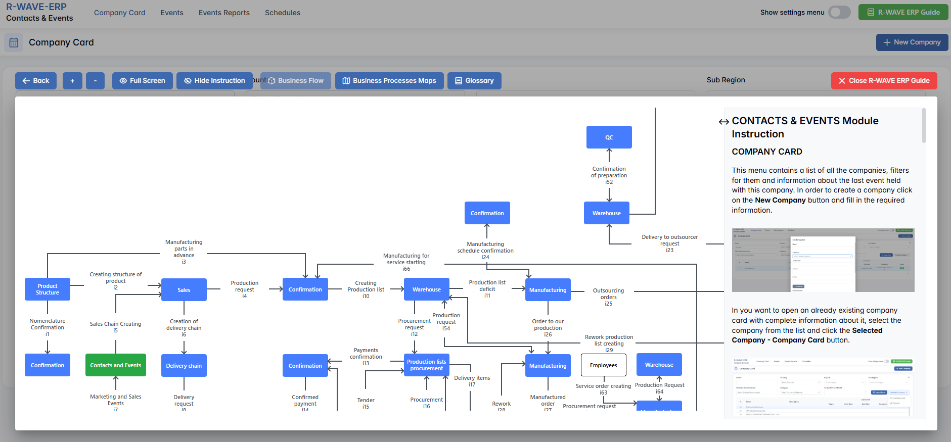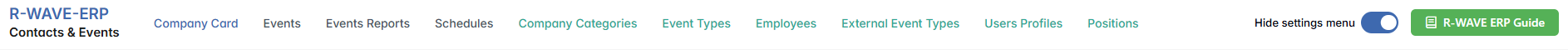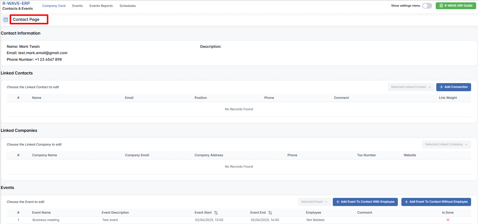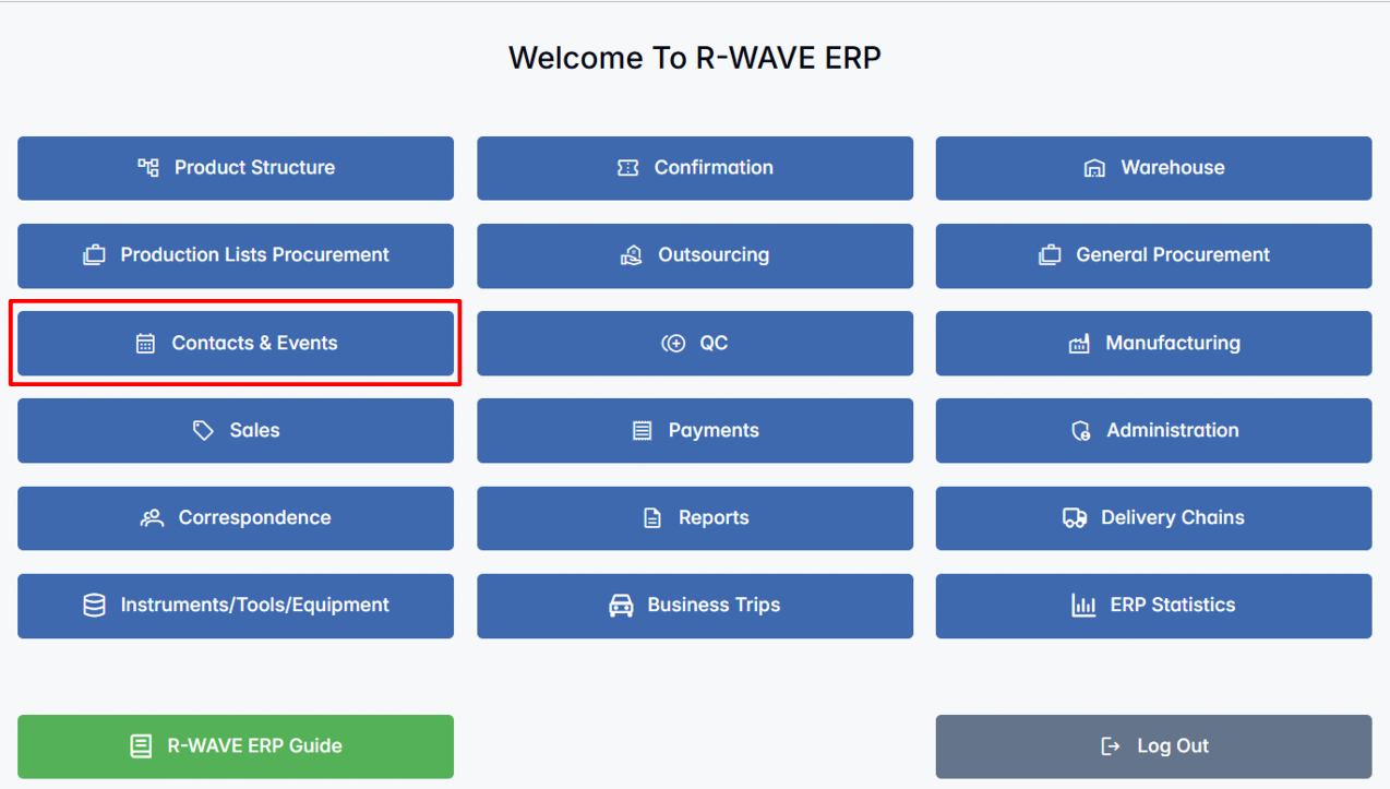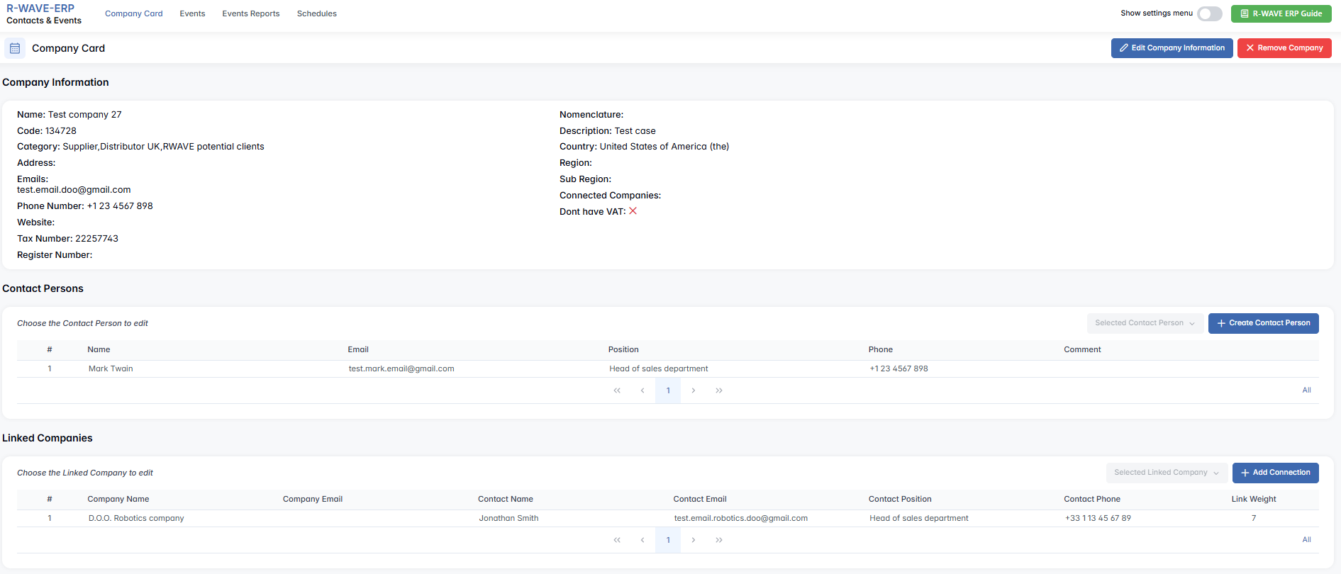 The Contacts and Events module in R-Wave ERP provides flexible tools for managing company profiles, associated contact persons, and related events.