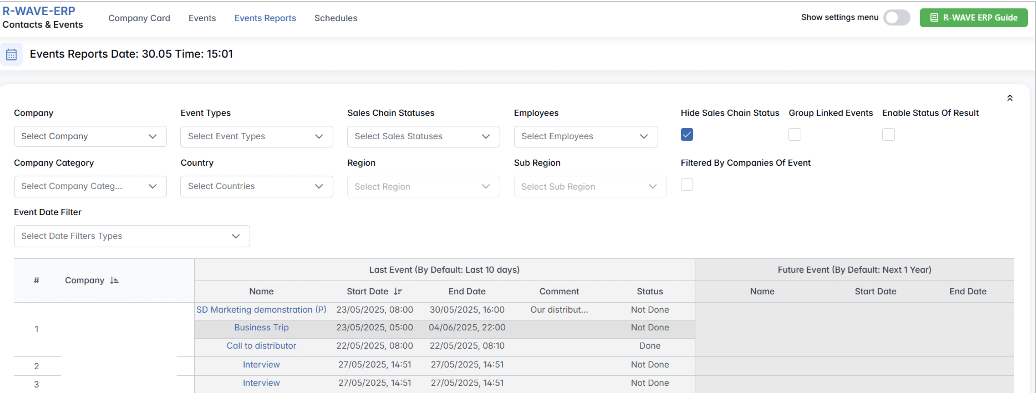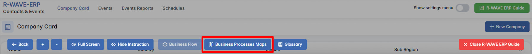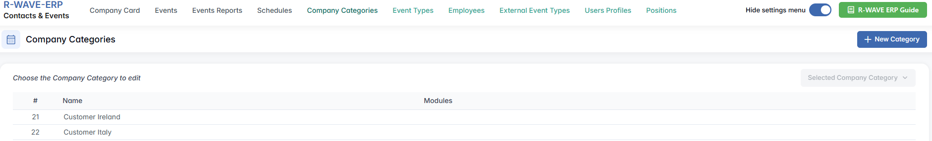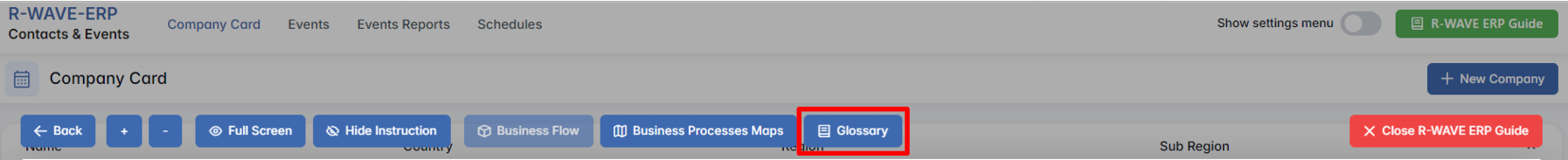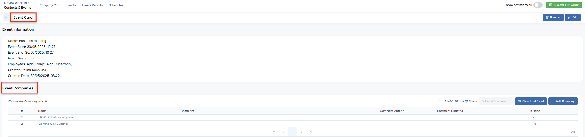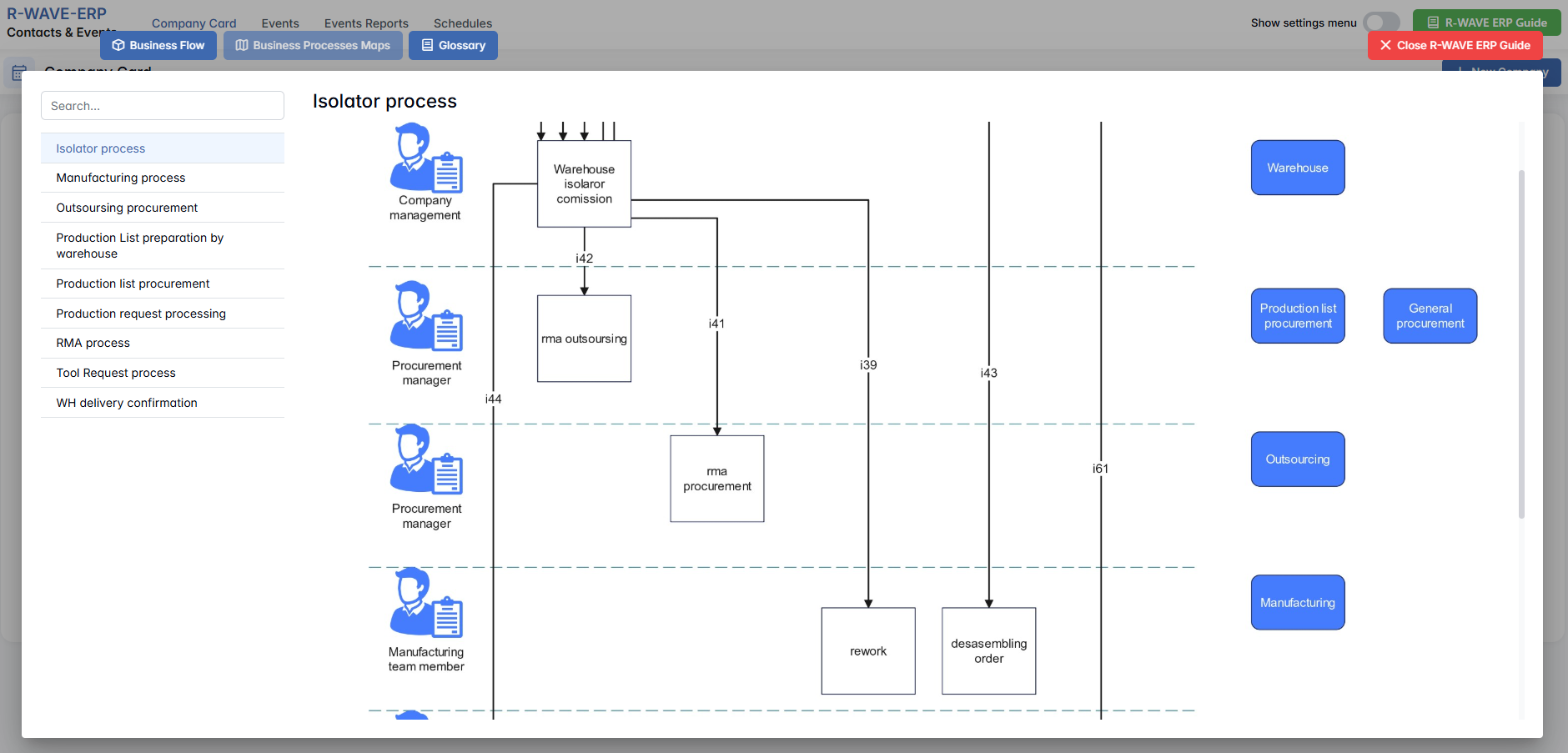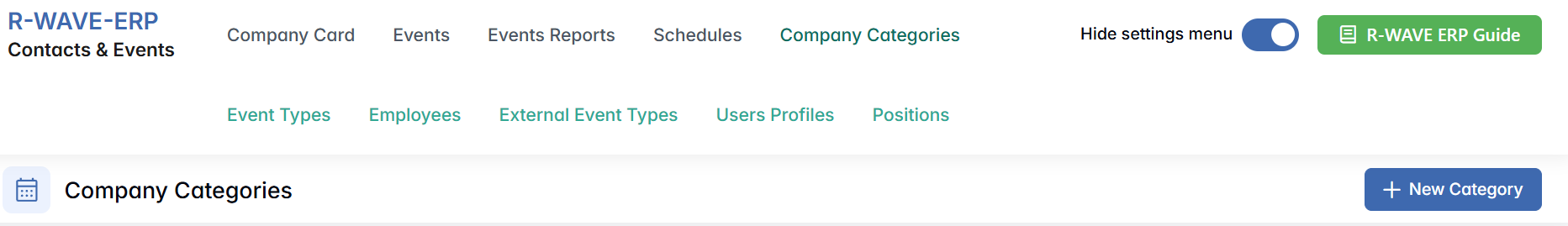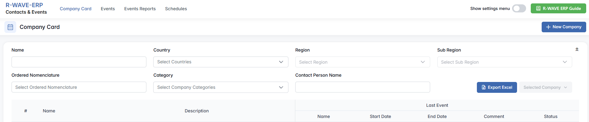 The Contacts and Events module in R-Wave ERP provides flexible tools for managing company profiles, associated contact persons, and related events.