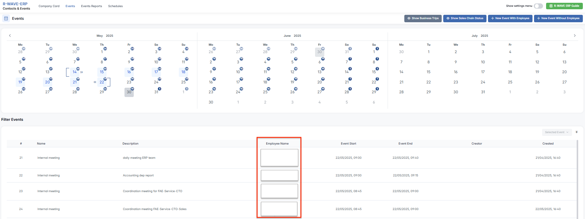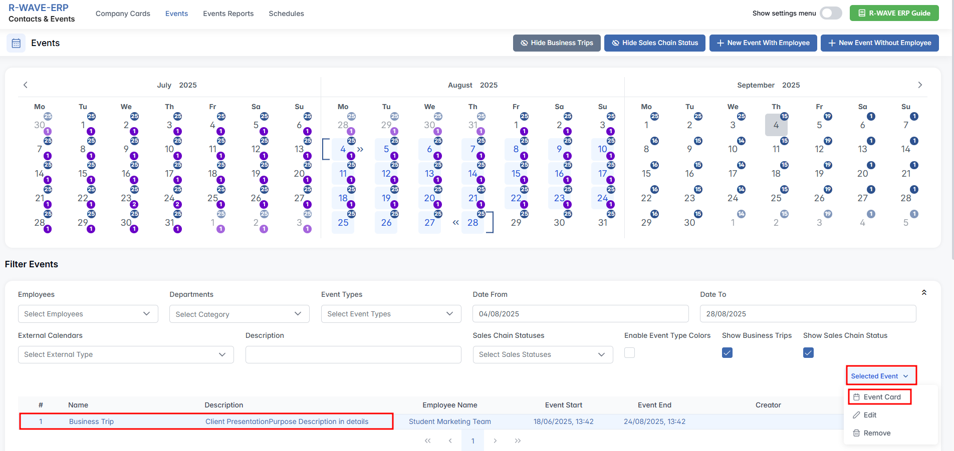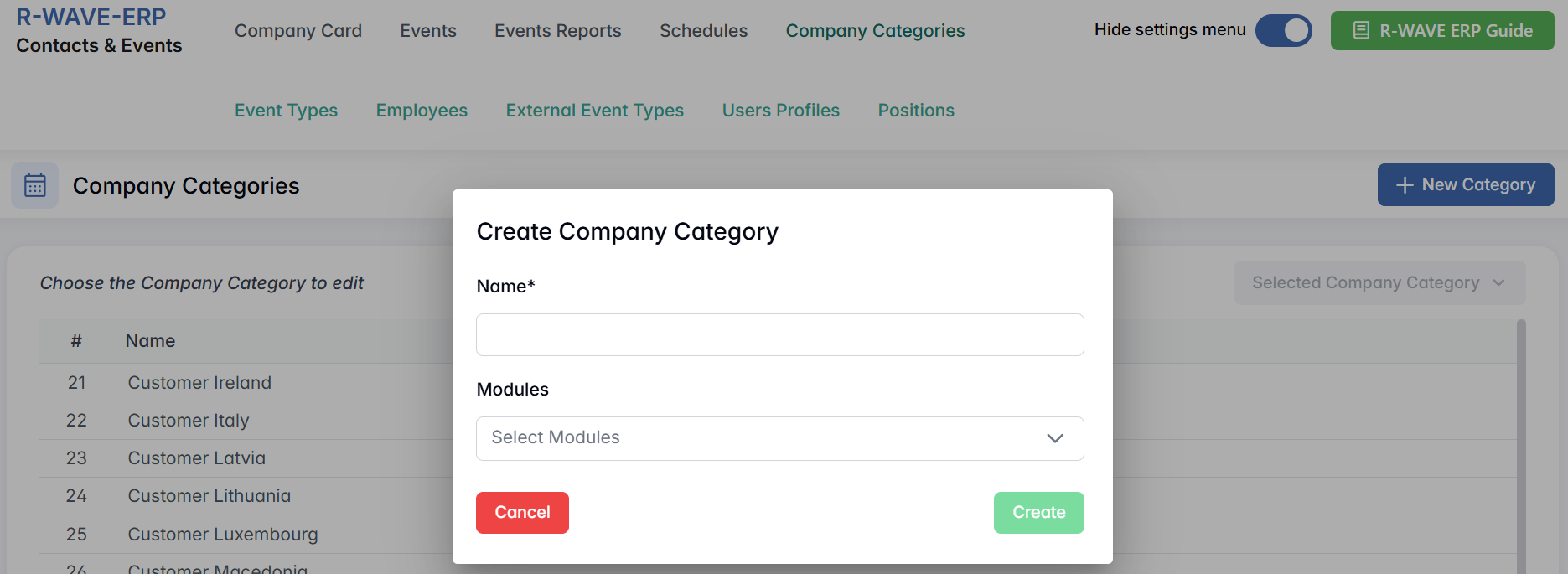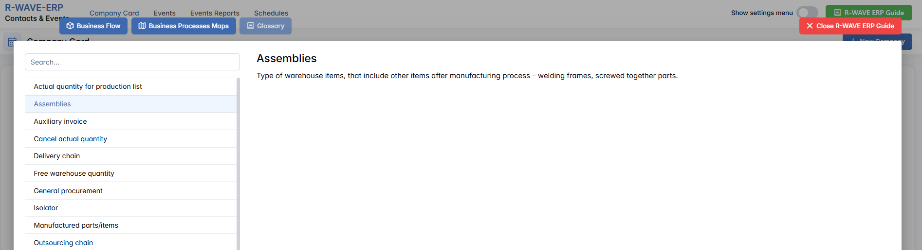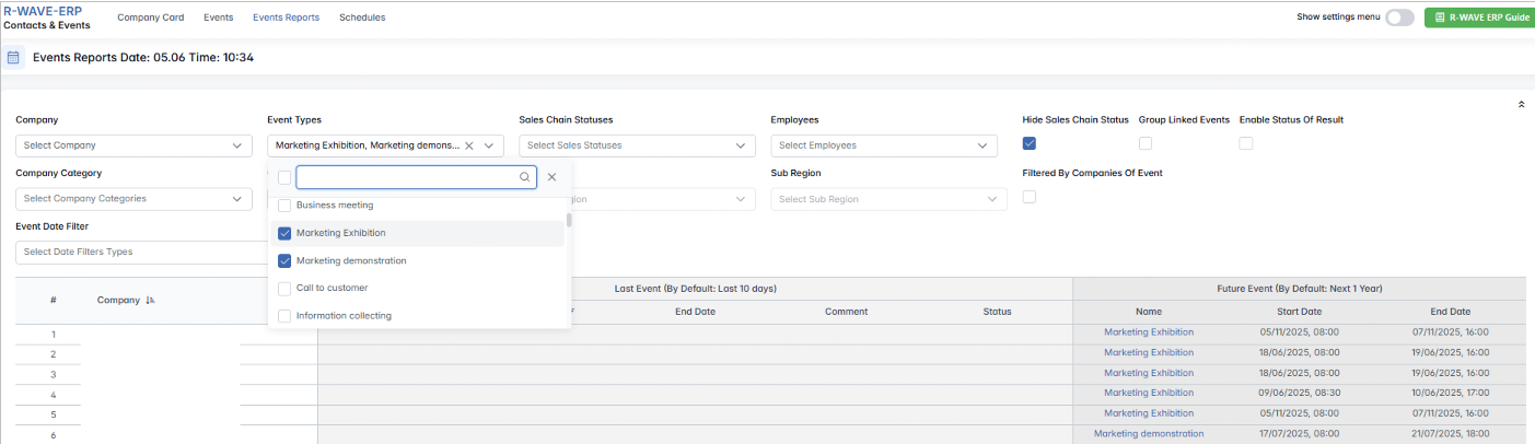The Contacts and Events module in R-Wave ERP provides flexible tools for managing company profiles, associated contact persons, and related events.