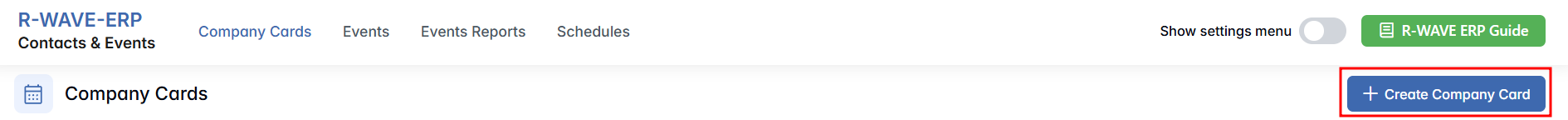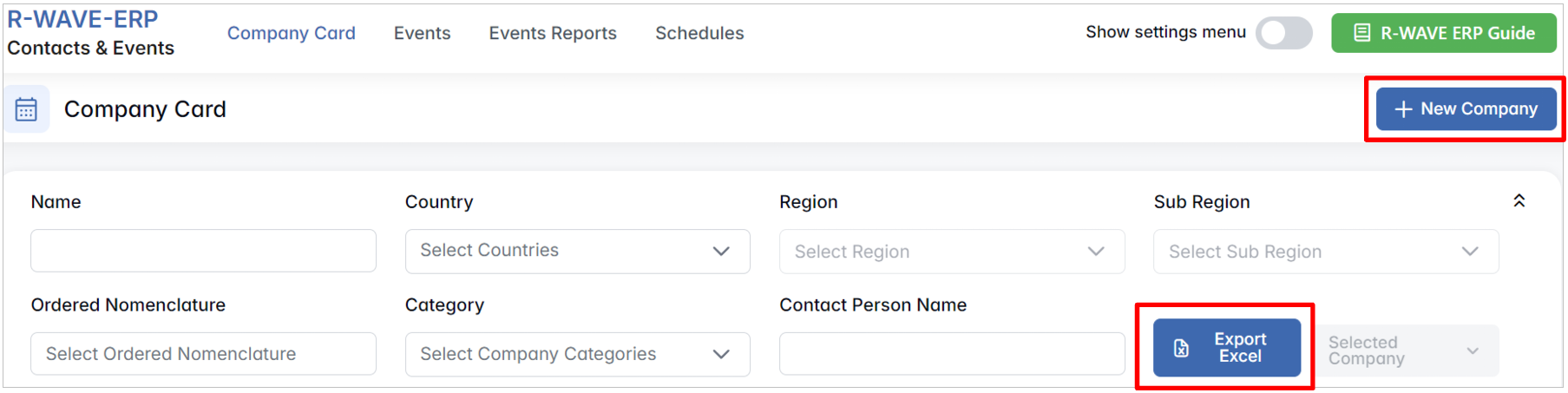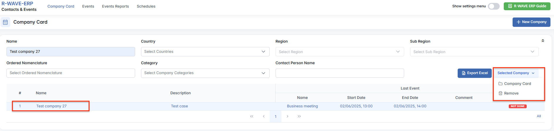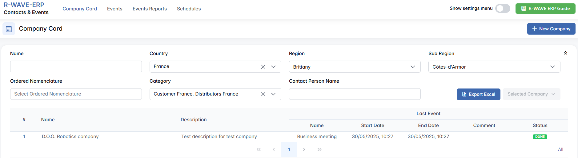 In the Contacts & Events module of R-WAVE ERP, you can easily add new companies to your system and manage their profiles over time. Each company is stored as a Company Card, which includes contact information, categorization, event history, linked data, and more.