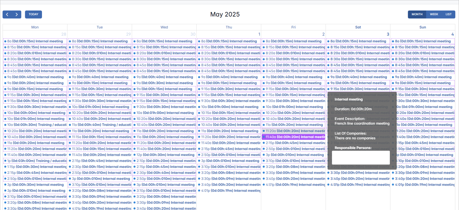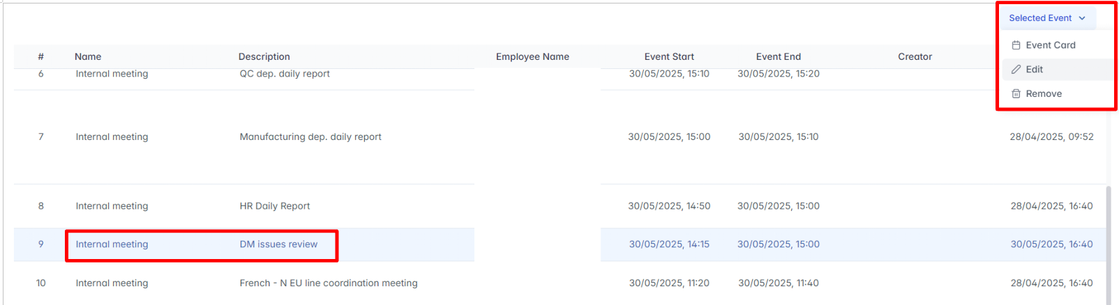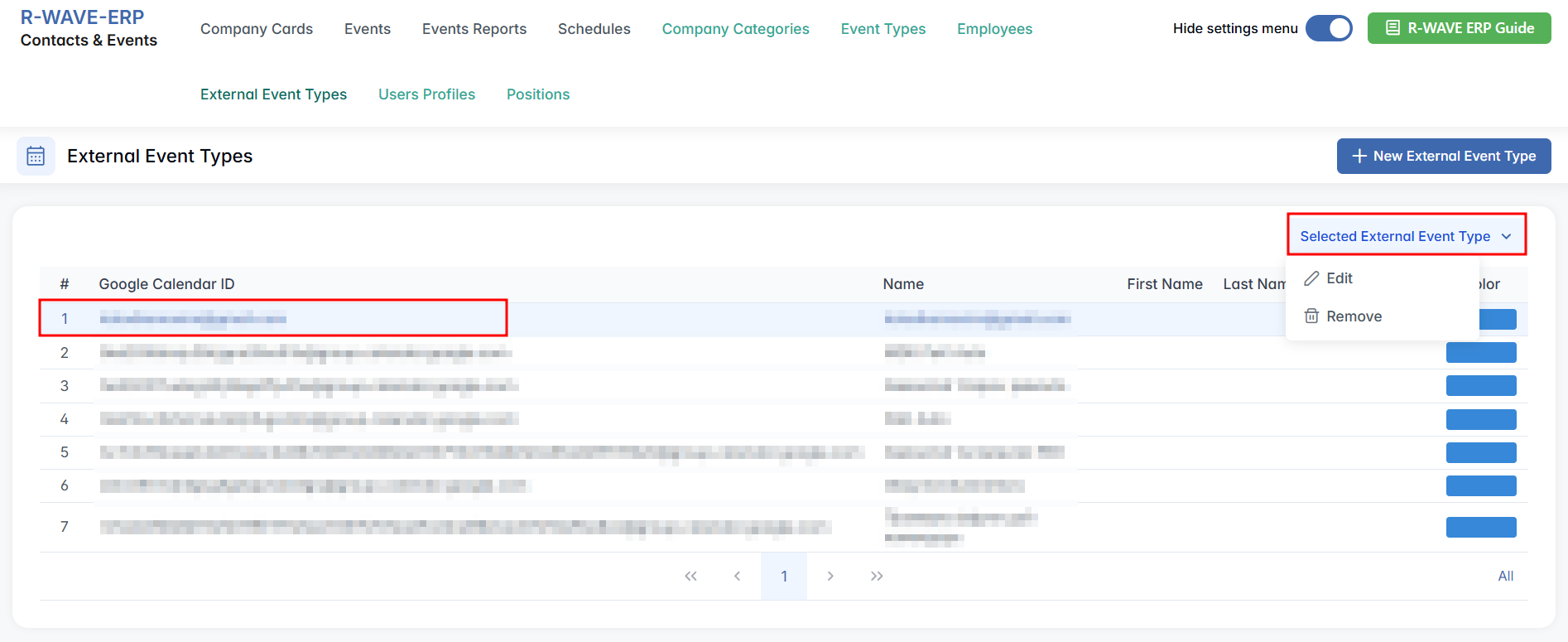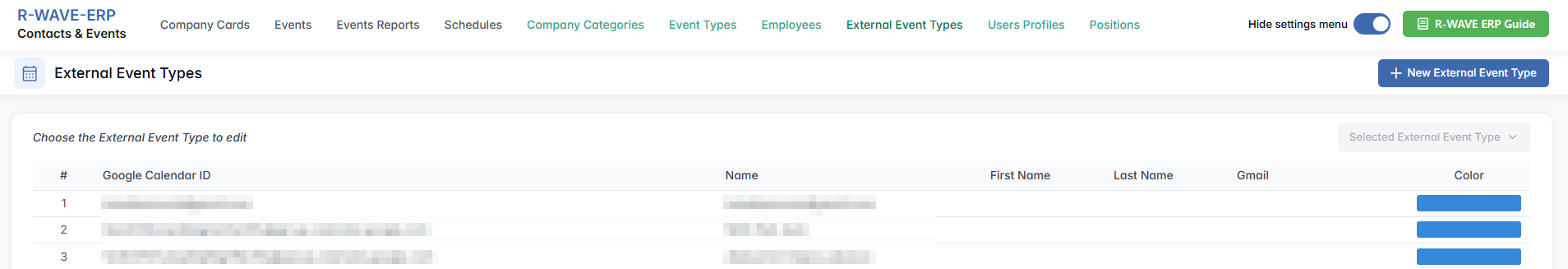 The External Event Types tab allows you to manage external calendar integrations — particularly with Google Calendar — by registering specific users whose Google events can be imported into the internal ERP calendar. This integration provides a way to automatically fetch and filter events created in personal Google calendars and display them within the system, based on their type.