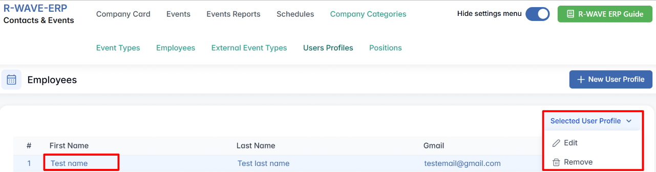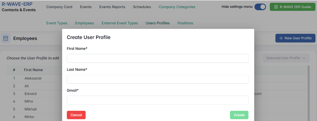 The User Profiles tab allows to register users whose Gmail accounts are used for internal ERP calendar synchronization. These profiles are primarily used to enable automated integration between R-Wave ERP and external Google Calendars for specific event types.