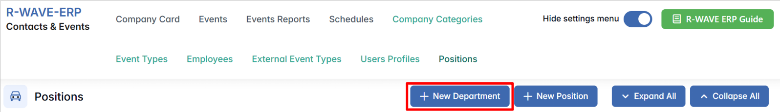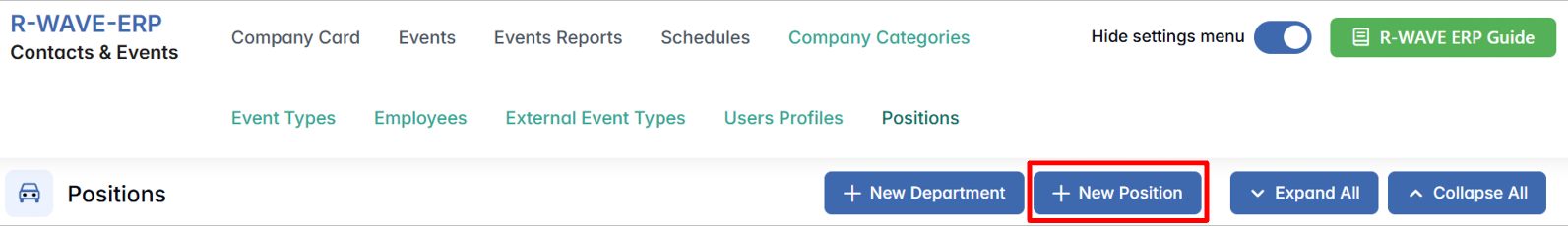 The Positions tab in R-Wave ERP allows you to manage your company’s organizational structure by creating and maintaining departments, sub-departments, and individual job positions. This structure supports assigning employees to the right roles and departments across the system.