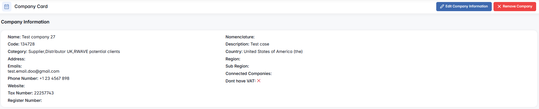 Then click Company Card to open the full profile of the selected company or Remove option to delete the company from the system.