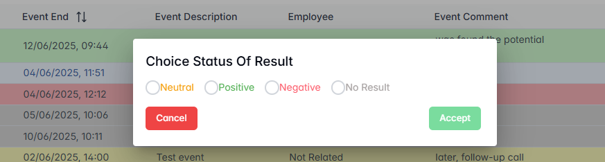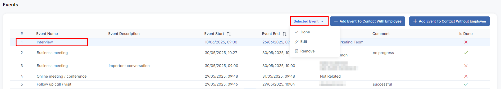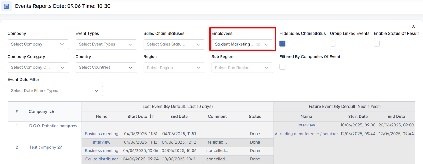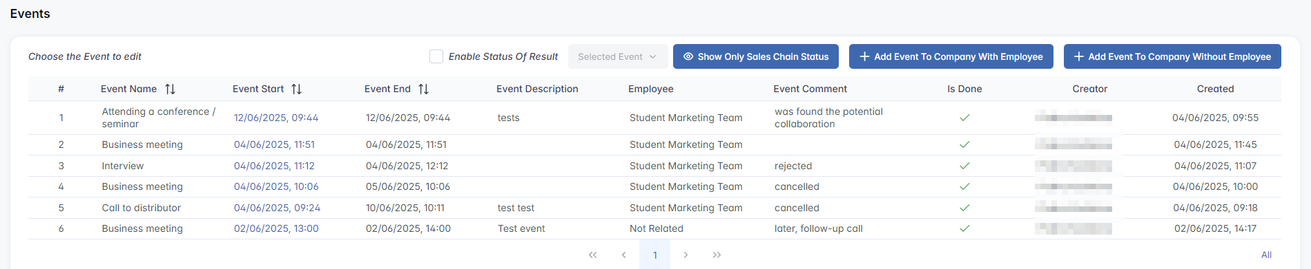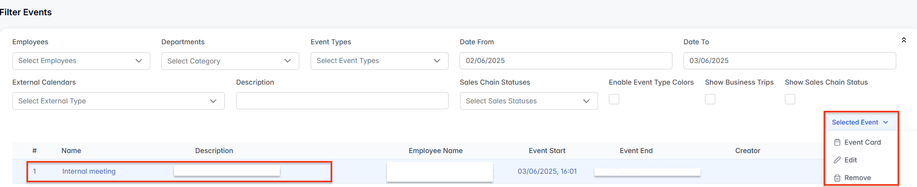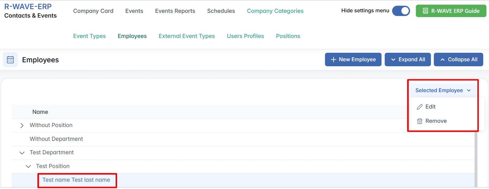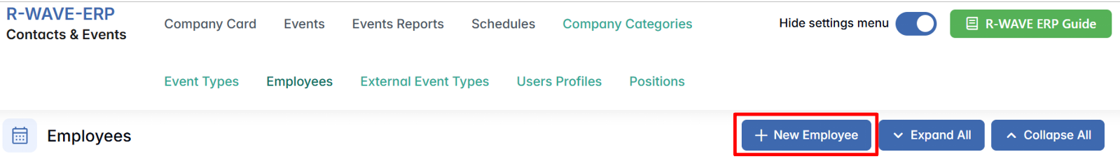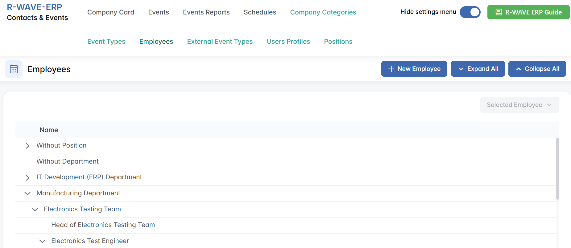 The Employees tab in the hidden settings menu of the Contacts & Events module allows to manage internal users of the system — those who participate in events, business trips, and sales chains. Employees are displayed in a structured format that mirrors your organization’s internal departments, but flexibility is also supported for non-categorized users.