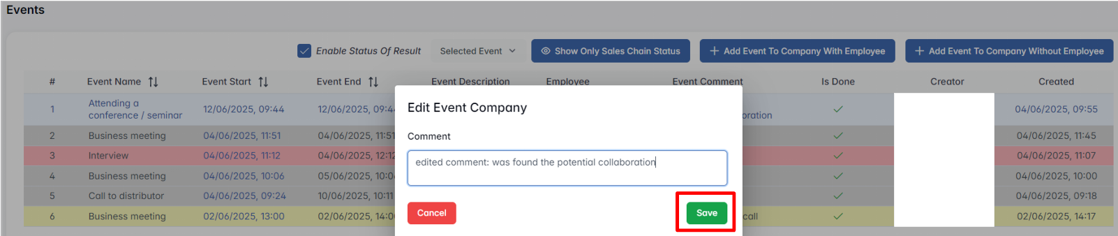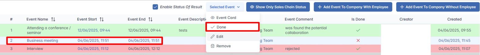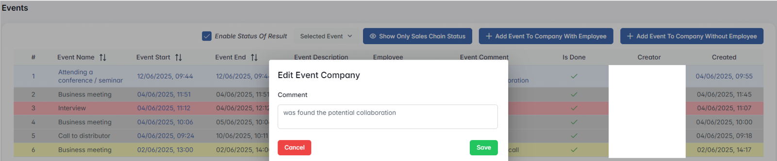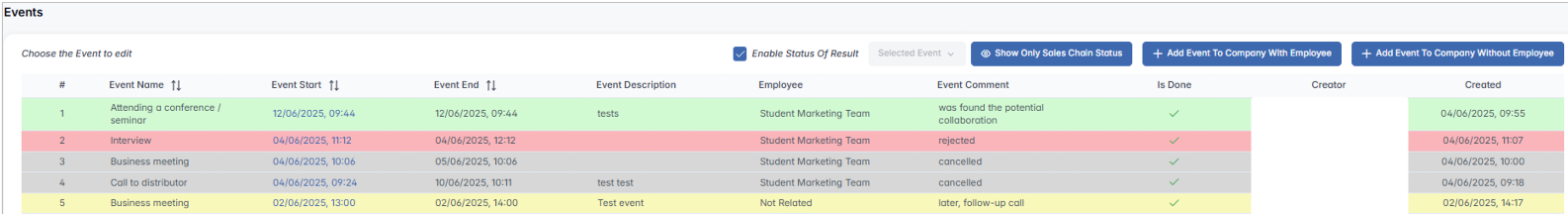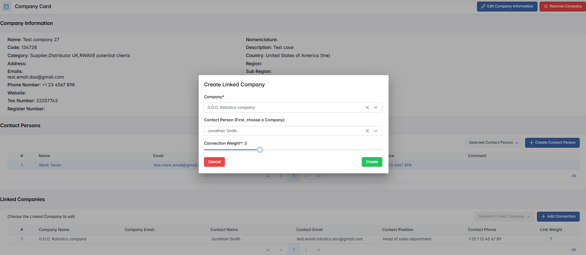 The Company Card tab is the central area for managing all companies that your organization interacts with — such as clients, suppliers, potential leads, or partners. Each company card can contain detailed information including region, category, and associated contacts. You can also track the latest events related to each company directly from this view.