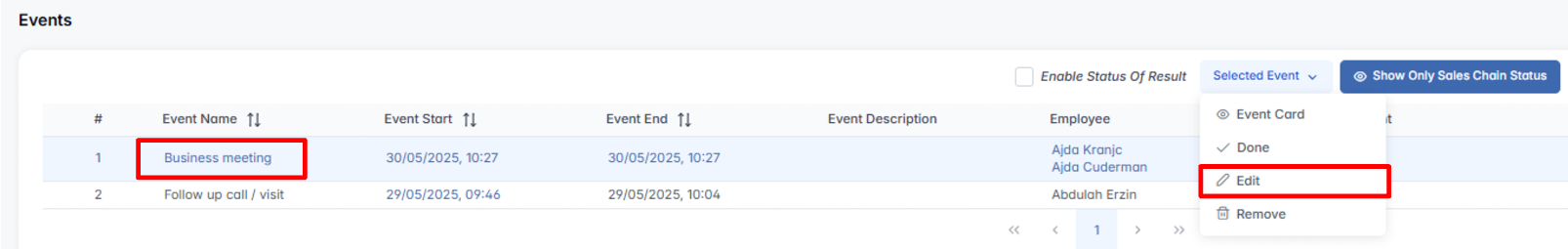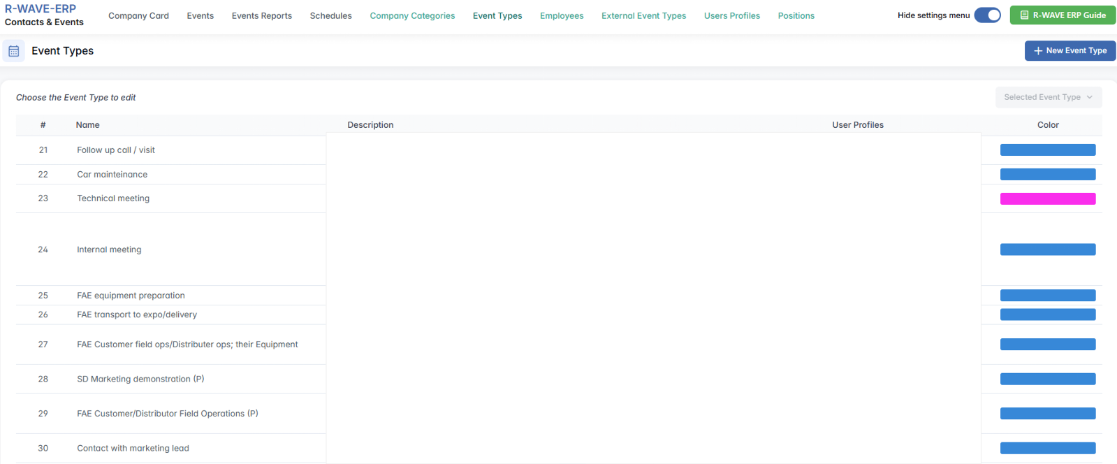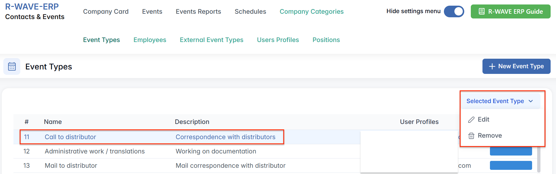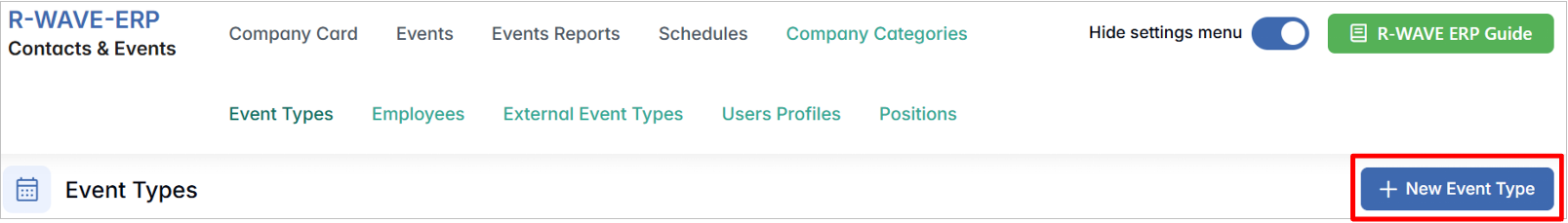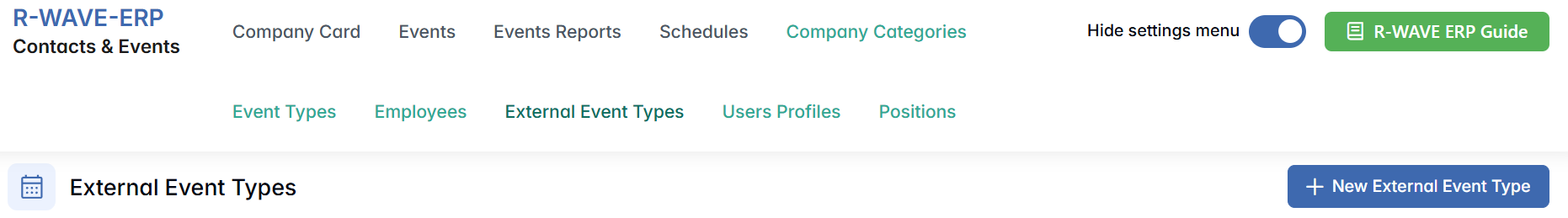- Go back to ERP → open the Contacts&Events module, then External Event Types tab.