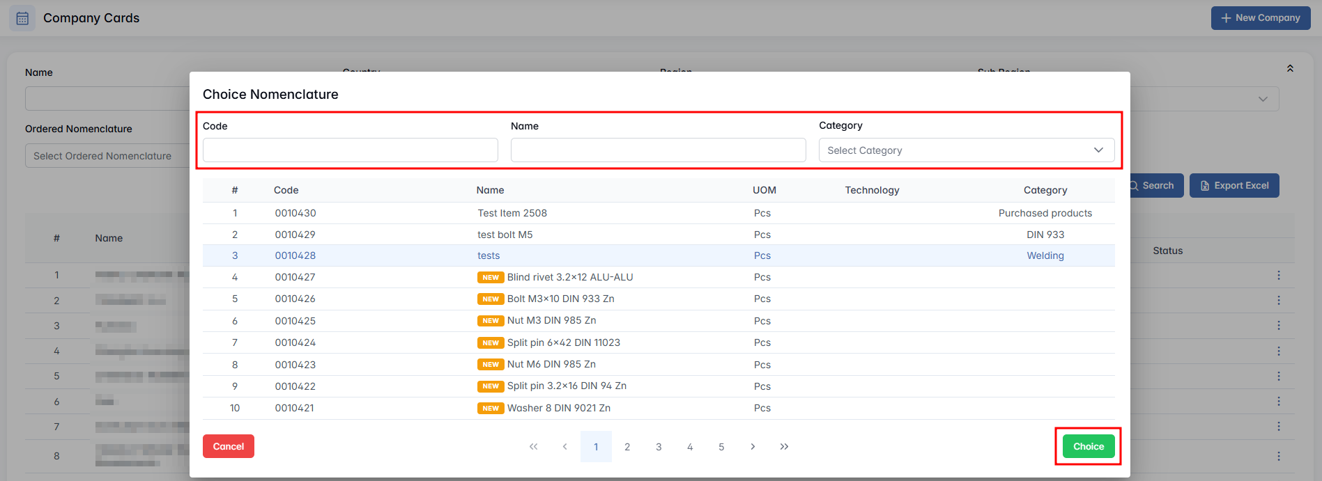- Ordered Nomenclature - This filter allows you to classify companies based on internal nomenclature structure. When clicked, a detailed selection panel opens with the following search fields: Code, Name, and Category. You can also select a nomenclature directly from the list displayed below the filter.