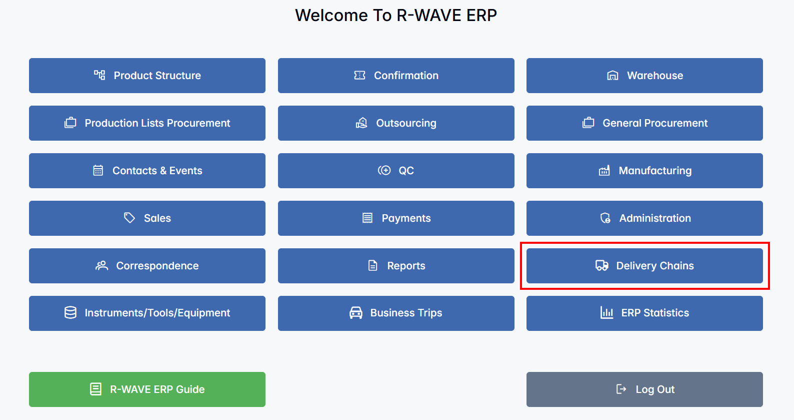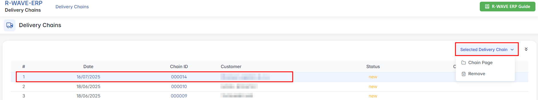 The Delivery Chains module in R-Wave ERP manages and tracks all outbound product deliveries that originate from the Sales module. It provides a centralized interface where logistics, invoicing, quality control, and payment statuses come together to support the successful fulfillment of customer orders.