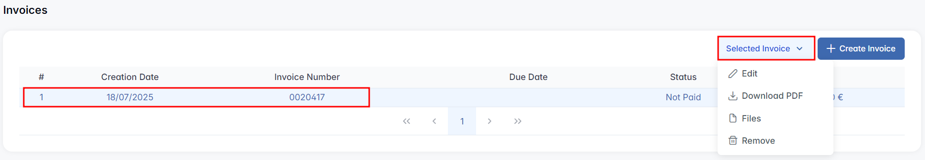 - Edit – Opens the invoice in the Reports module for further input (dates, additional Invoice Services, files).