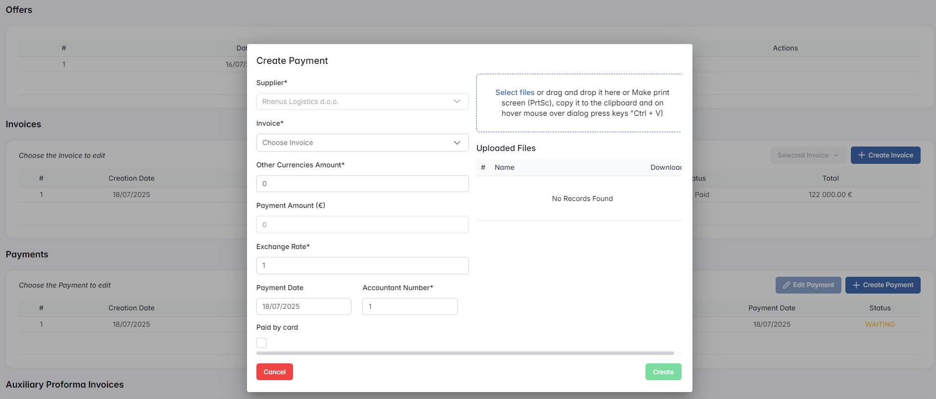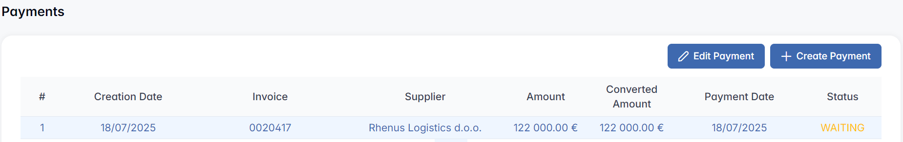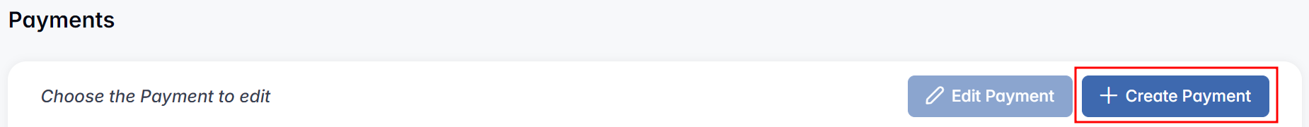 Once an invoice exists, users can proceed to record a payment using the Create Payment button.