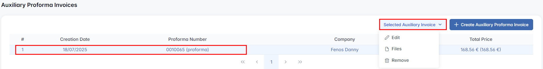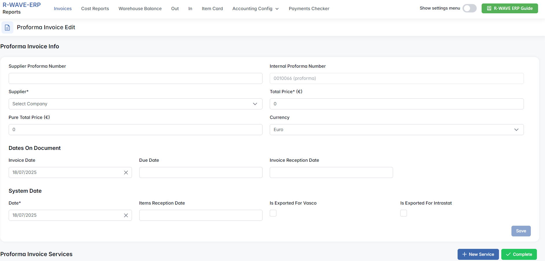 - Edit – Opens the invoice in the Reports module for further input (dates, additional Proforma Invoice Services, files).