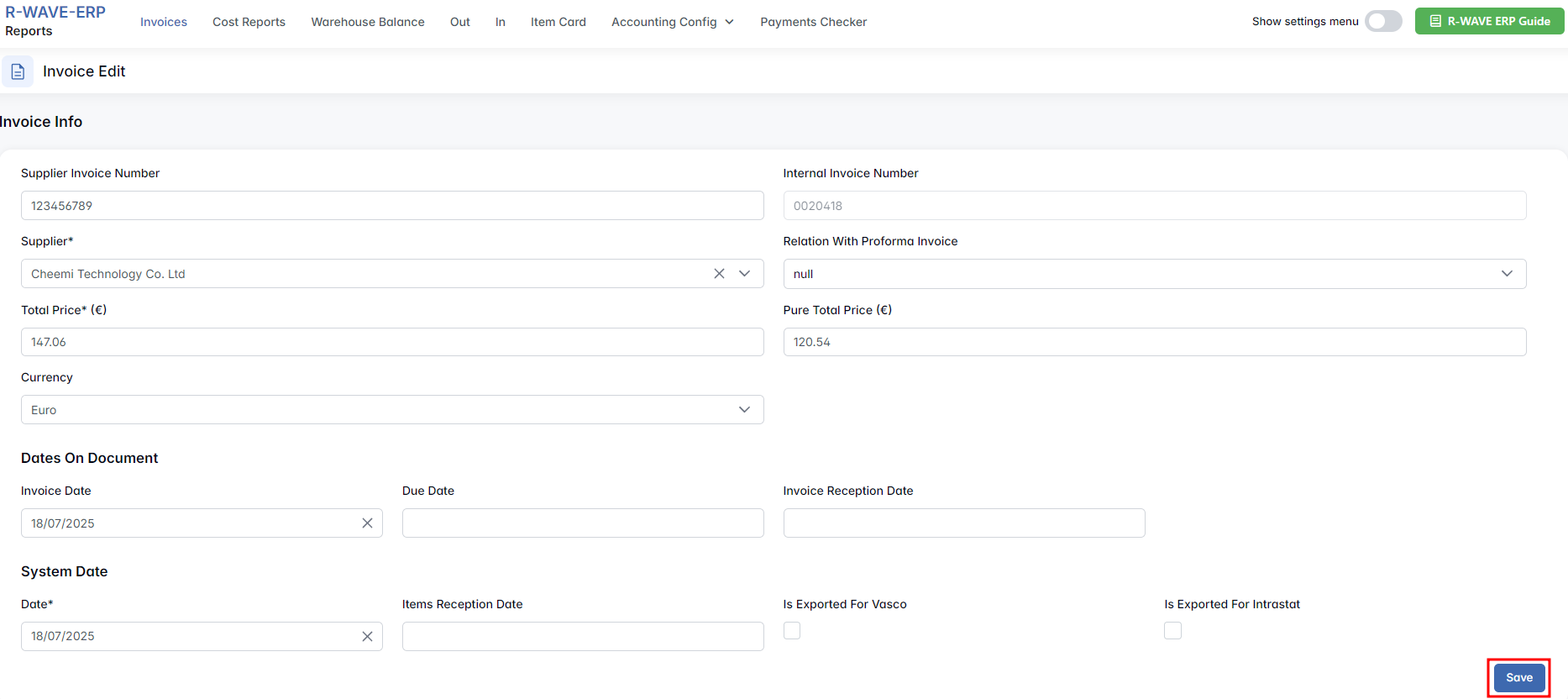 Note: Total Price (EUR), Pure Total Price (EUR), and Internal Invoice Number are not editable.