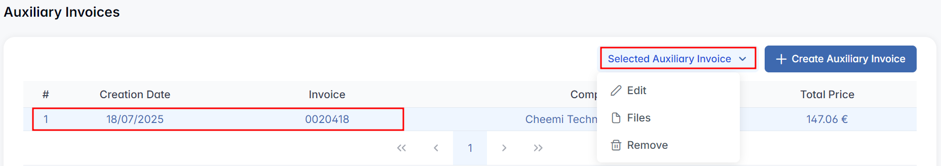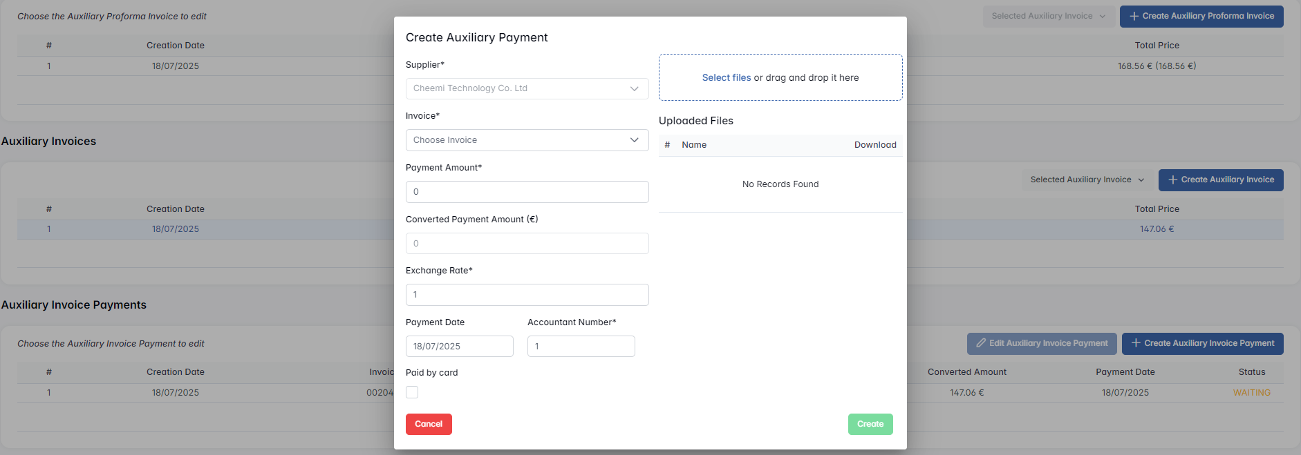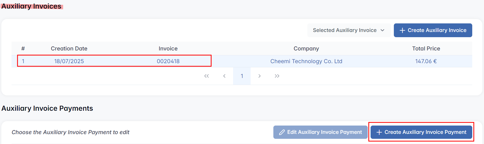 To record payments for the auxiliary proforma invoices, users must first select an invoice from the list above (Auxiliary Invoices). This activates the Create Auxiliary Invoice Payments button.