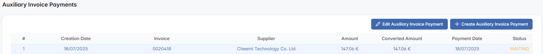 The Edit Auxiliary Invoice Payment button becomes available (activated upon row selection).