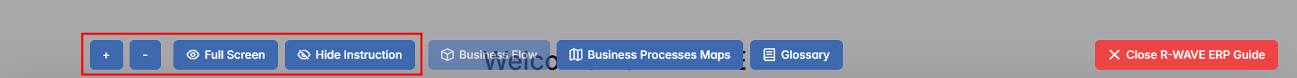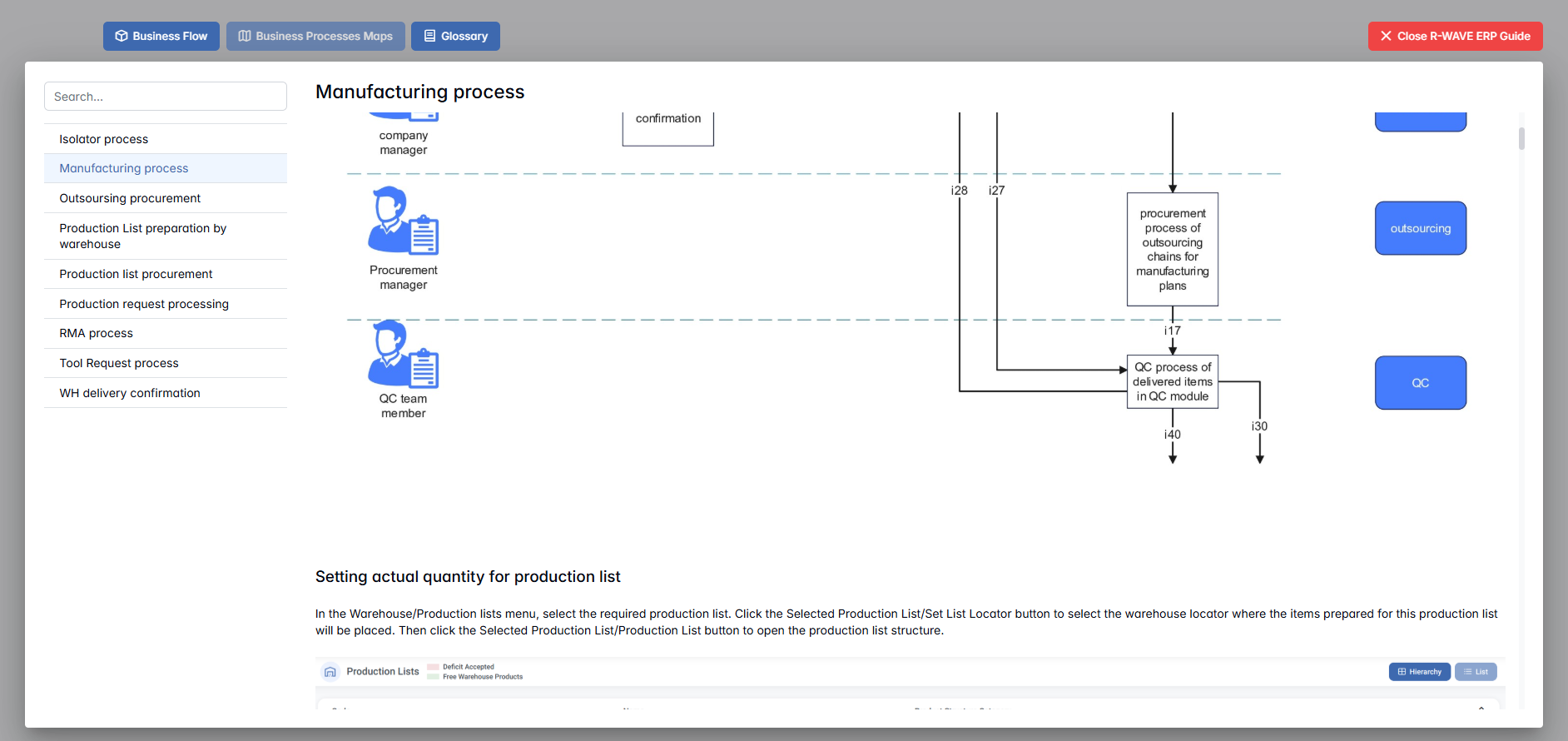 The R-WAVE ERP Guide is an integrated help system designed to support users as they work within the ERP environment. It provides real-time, context-aware assistance through a dedicated window that combines visual business process diagrams with step-by-step operational instructions. The guide is accessible from any module and is aimed at improving navigation, clarity, and overall system understanding.