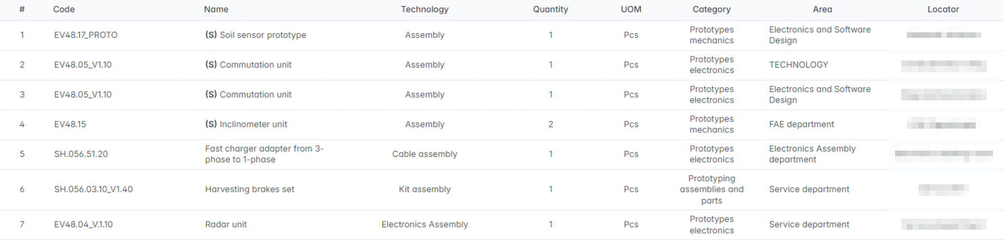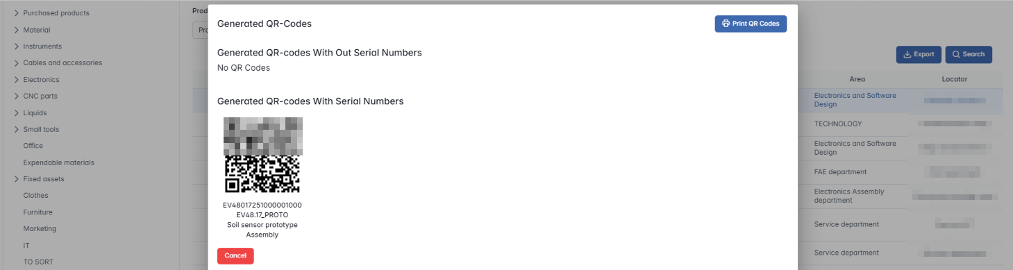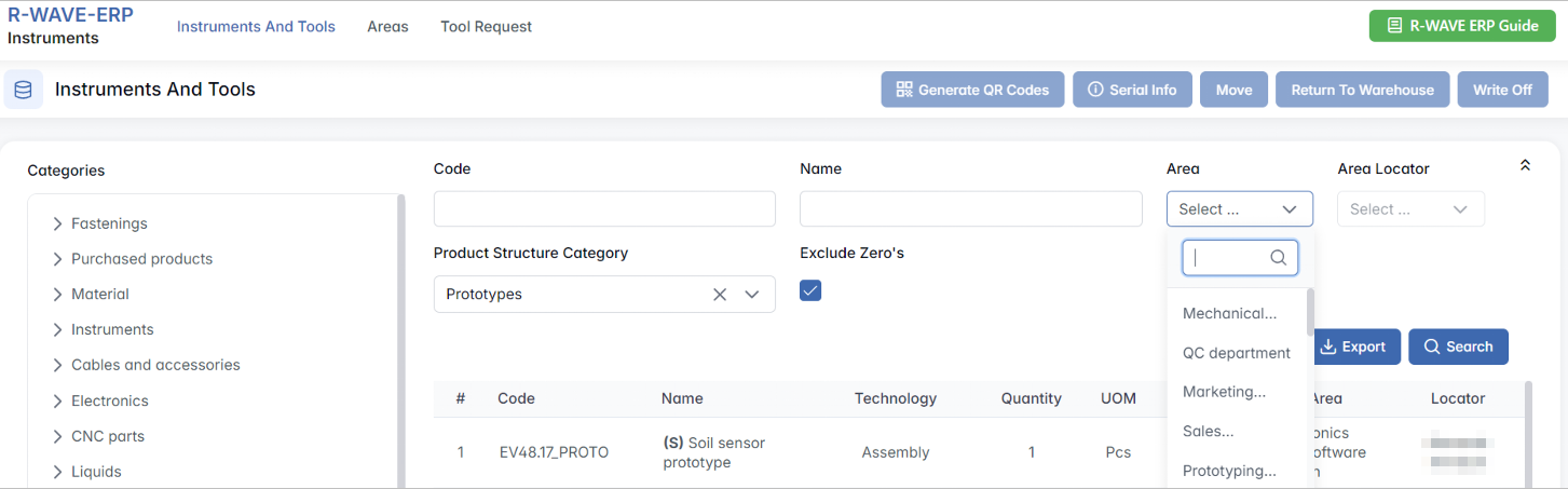 - Area – Filters by physical storage or usage area (e.g., "FAE department").