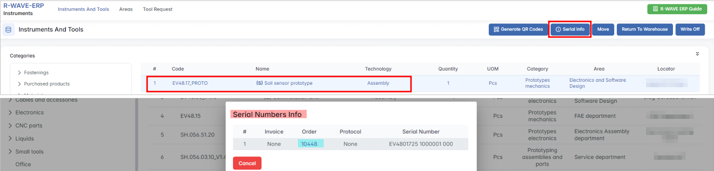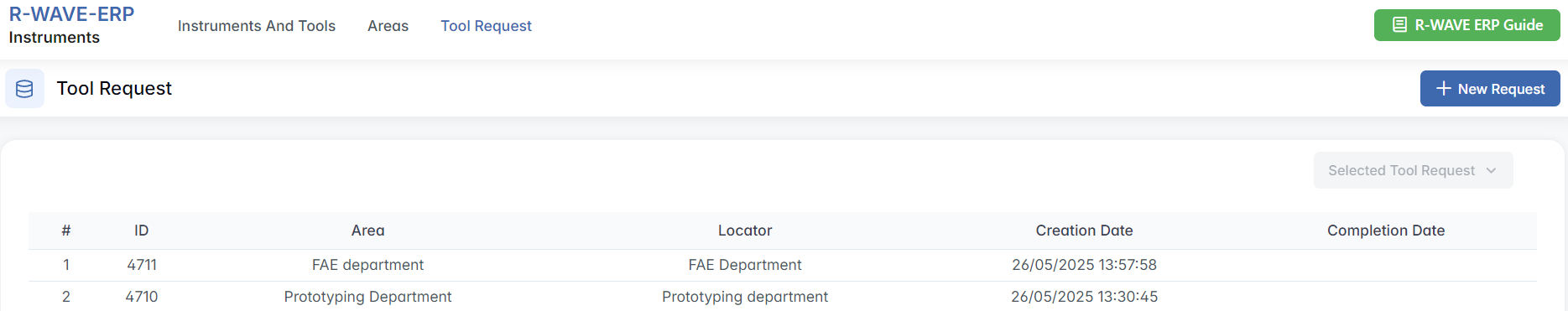 This module provides a complete overview and management of all instruments, tools, and technical equipment used within the organization. It ensures real-time tracking of tool location, availability, usage history, and requests. It consists of three main tabs: