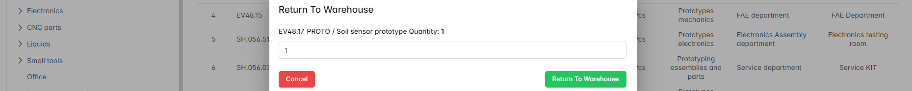 - Return to Warehouse – Returns items currently in use to their assigned warehouse stock.