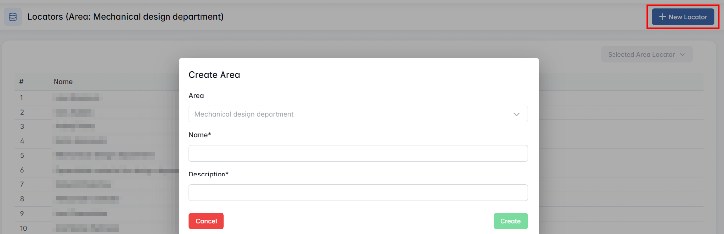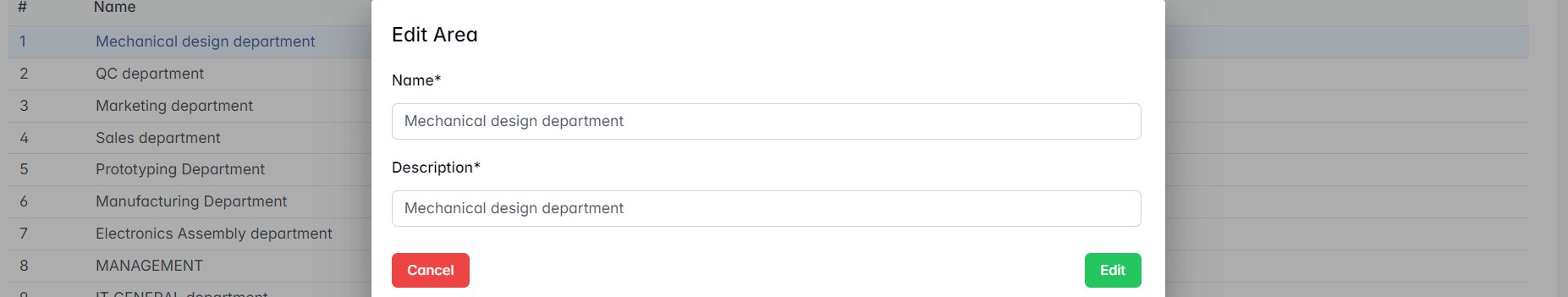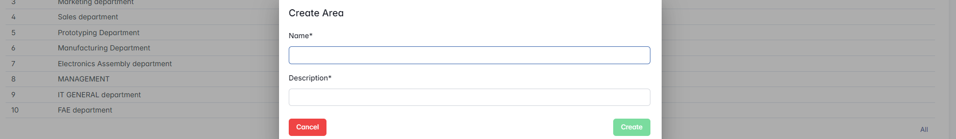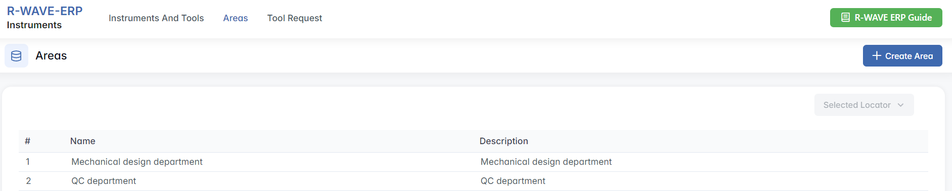 This tab allows users to define physical storage or usage areas across the organization. Areas can correspond to departments, labs, warehouses, or even mobile workspaces.