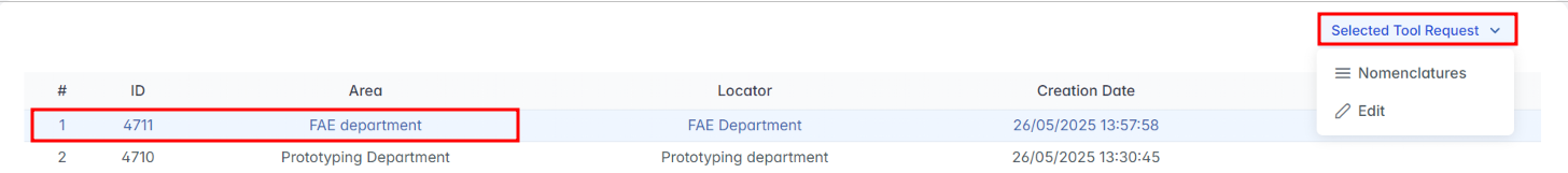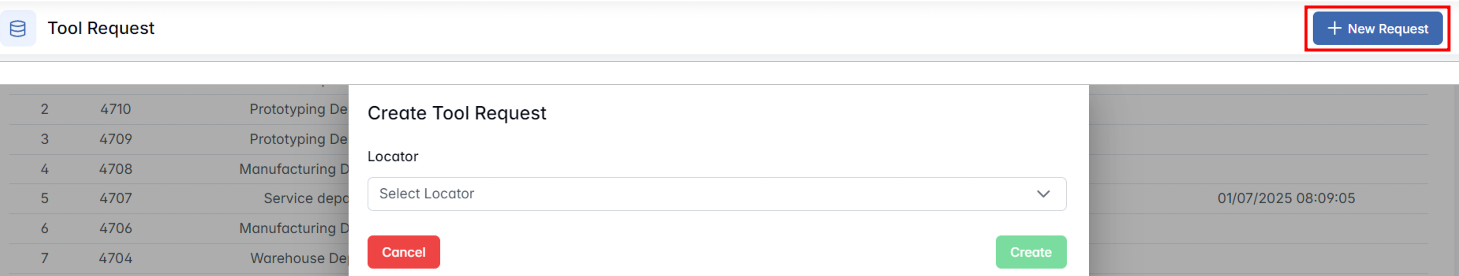 To add a new request click on + New Request in the upper right corner. With this you will initiate a new tool request. A pop-up window will appear where the user must select a Locator (which area/location needs the tools).
