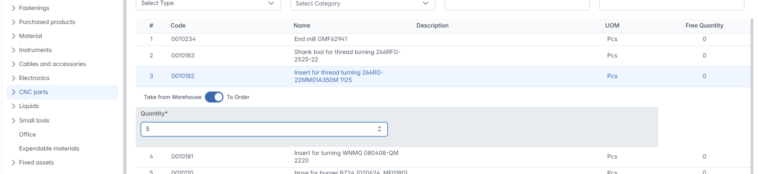 - If the item is not available in stock, switch the toggle to To Order and specify the desired quantity. In this case, the request will be forwarded to the procurement department, and once the item is delivered to the warehouse, it will be assigned to the tool request.