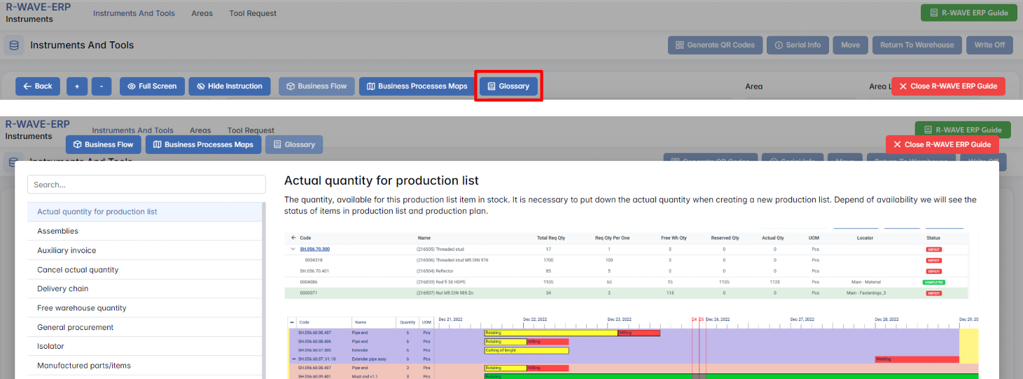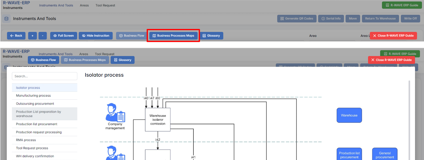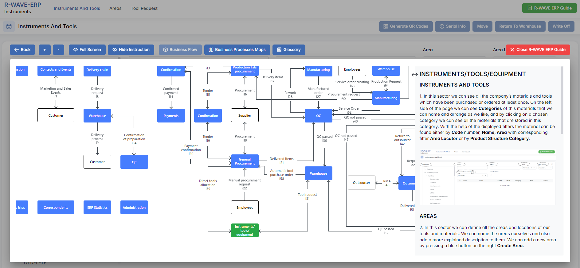To support user navigation and clarity, R-Wave ERP includes a built-in contextual help system in the form of a pop-up guide window. This feature is available across different modules, including Instruments/Tools/Equipment, and is designed to help users understand where they are in the system and how to use the current section effectively.