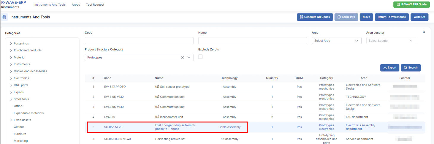 Category Panel – Displays a custom hierarchical structure of tool categories (e.g., “Prototypes,” “Electronics,” “Assemblies”). These can be defined manually and grouped logically for convenient navigation.
