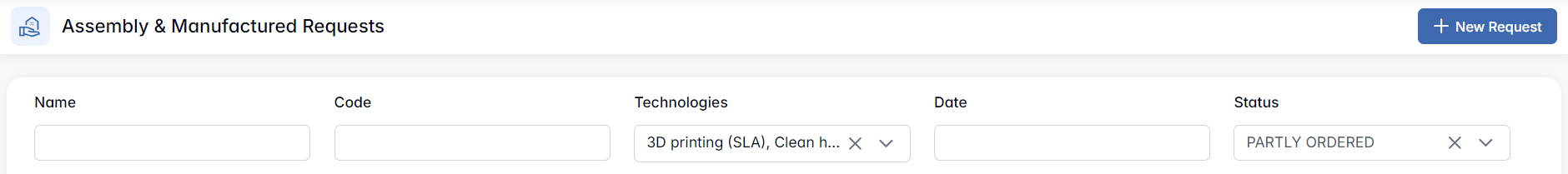 Located at the top of the Assembly & Manufactured Requests interface, this tab allows users to narrow down visible requests using basic and advanced filters: