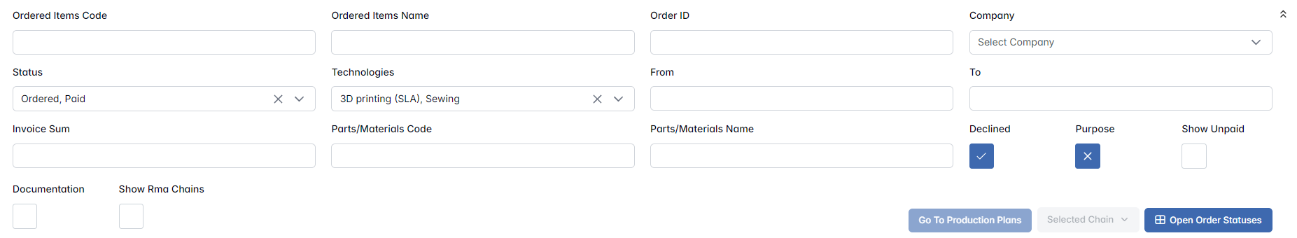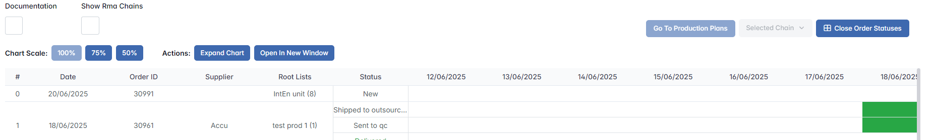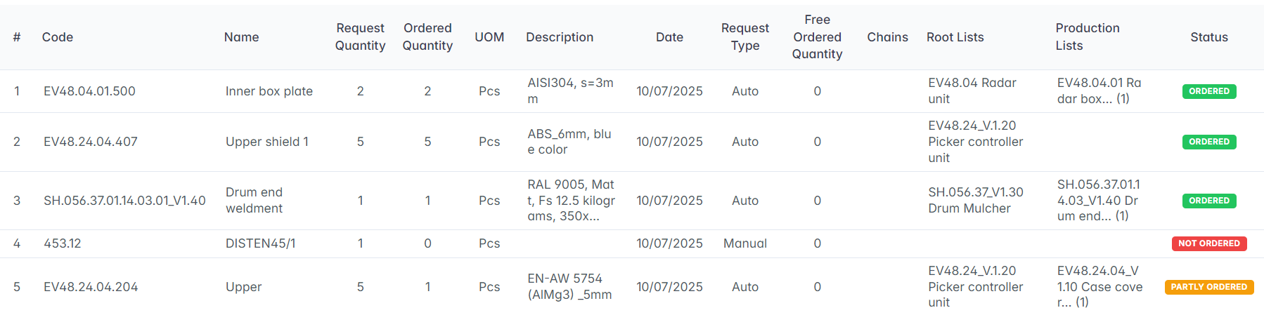 - PARTLY ORDERED (orange) – Some of the requested quantity is already included in chains, but not fully.