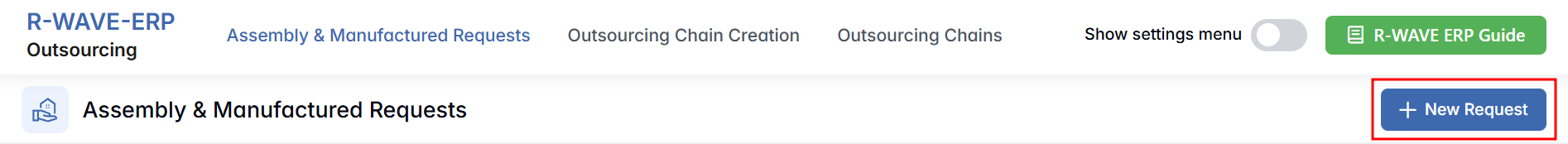 To manually add a new item to the outsourcing request list, click the “+ New Request” button at the top-right of the screen.
