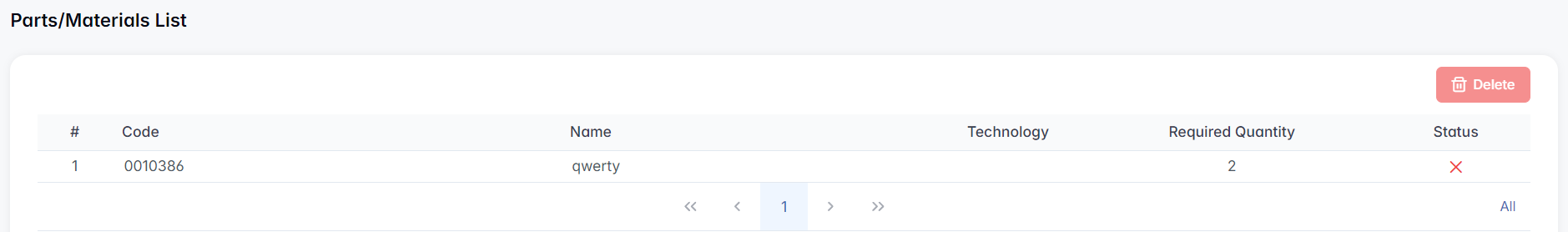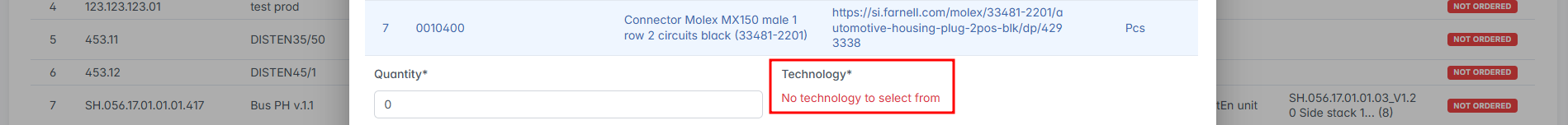 If the item has no technologies defined, the system will display the message: “No technology to select from” — and the row cannot be added.